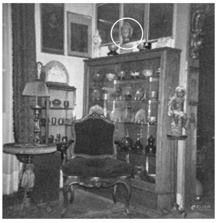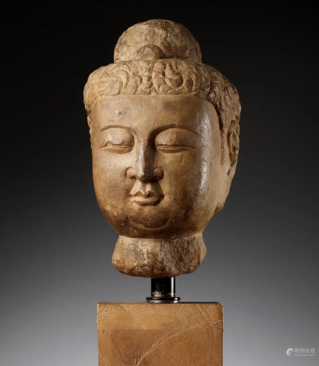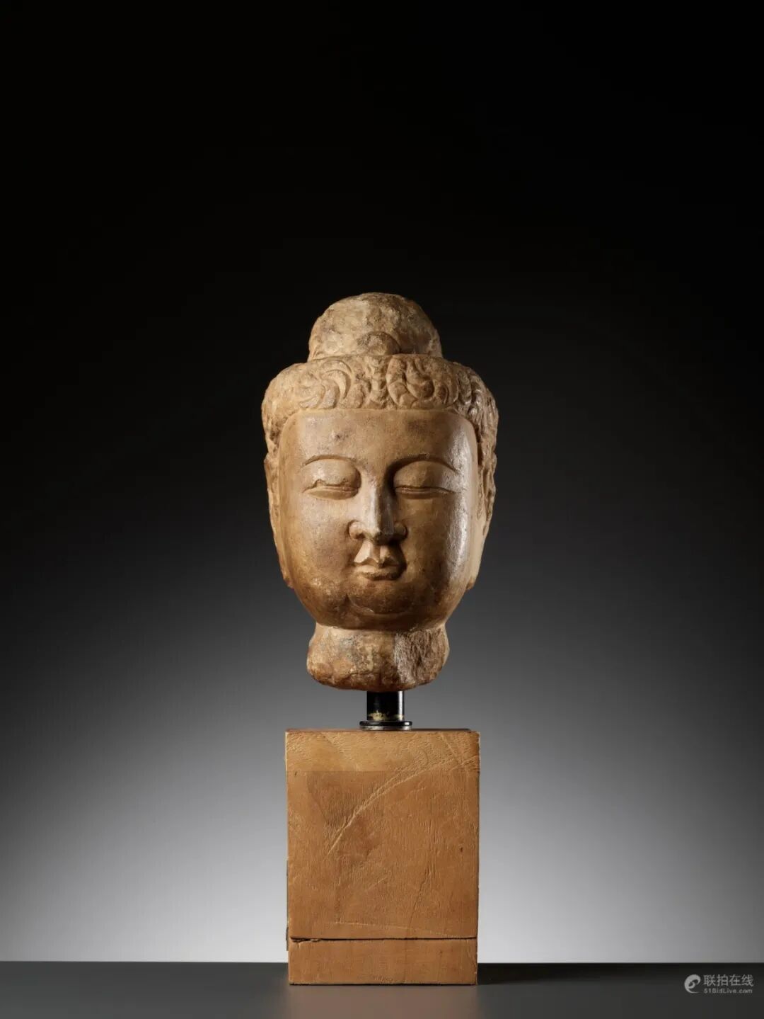 庄严、大气、饱满的佛陀头像,面部略显丰腴。眼睛细长,拱形的眉毛,与形成与鼻脊形成了和谐的曲线。眉间白毫,以及盘到头上的高高发髻,表现出唐代佛像经典风格。René Vittoz(1904-1992)瑞士罗曼语学者、法语和艺术史教师。他撰写了《Essai sur les Conditions de la Poesie Pure》等书籍,并编著有戏剧《L'ivresse de Noé》(诺亚的醉酒)。他同时也是一位画家,并且是具有十足热情的亚洲与欧洲艺术品收藏家。在其去世后,他的多件藏品上拍佳士得。图中展示架最上方为此件唐代大理石佛头。