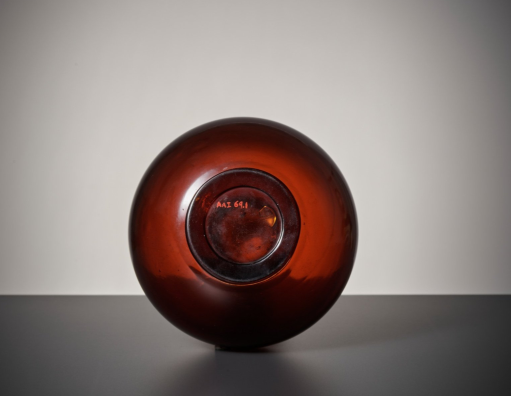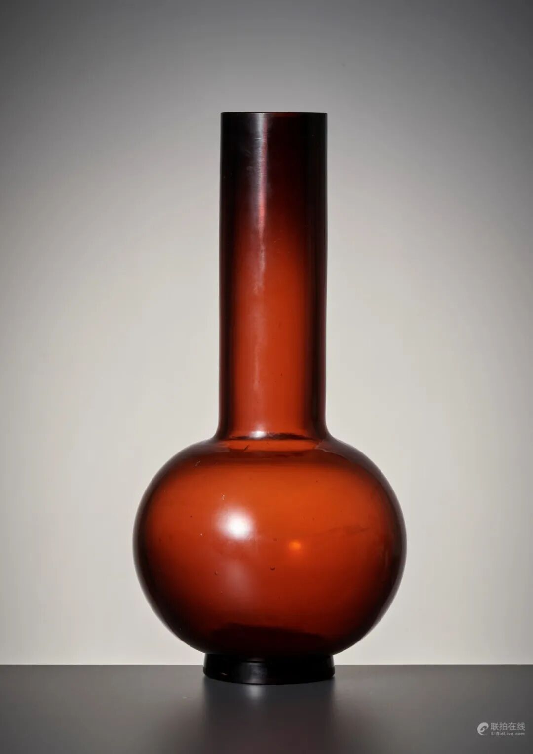来源:美国俄亥俄州Akron Art Museum美术馆,编号 AAI 69.1 (见底部),于 1990 年代退出收藏。纽约私人收藏,购自上述美术馆。颈部长且直,圆腹,圈足稍外撇。料器半透明,呈深琥珀色。Akron Art Museum 美术馆于1922年2月1日作为 Akron 艺术学院首次开放。