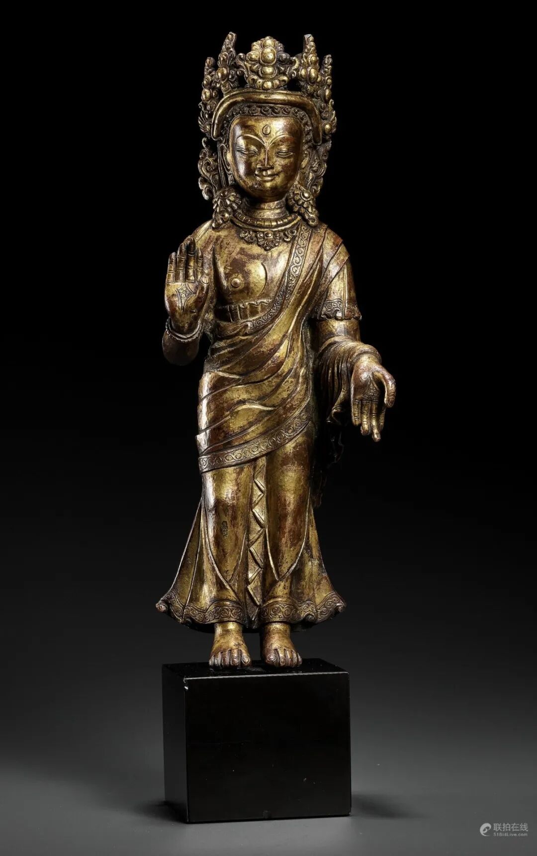 来源:纽约 J. J. Klejman,1974年前;纽约苏富比 Sotheby’s Parke-Bernet,1974年10月26日 Lot 4;纽约私人藏家,购于上述拍卖行。备注:John J. Klejman(1906-1995)曾是知名的波兰裔美国藏家和经销商,1950年在纽约成立了 Klejman Gallery 艺廊。精美铸造燃灯佛成三摩地冥想状态,佛祖左手饰与愿印,右手施无畏印,身披半肩式过膝大褂,裙褂上簪刻纹路精细,裙摆自然舒展。面容安详,眼睑下垂,眉毛微微拱起,眉间白毫,两侧是长长的耳垂,佩戴着精致的耳环。头戴五叶冠,头发成螺髻。