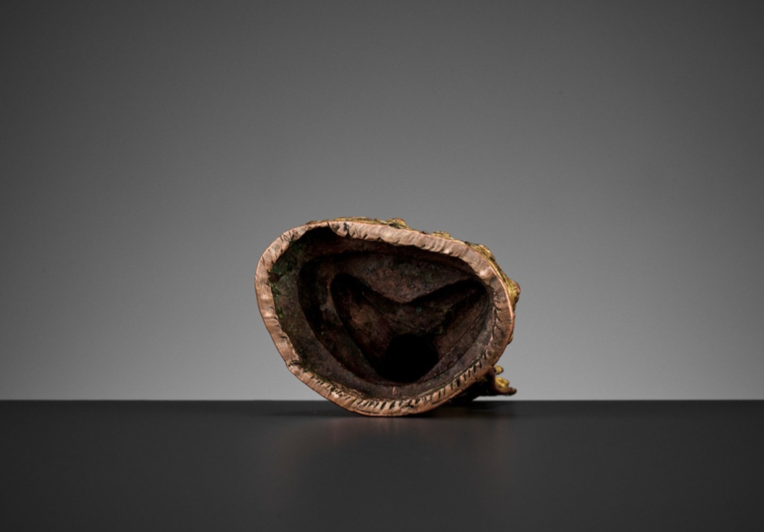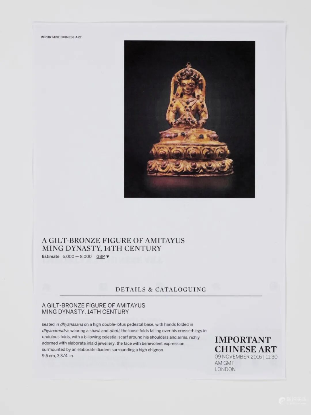 来源:伦敦私人收藏;伦敦苏富比 Important Chinese Art 2016年11月9日 lot 279, 估价 GBP 6,000-8,000;匈牙利私人收藏,购于上述收藏。无量寿佛结跏趺坐于双层莲座上,手结禅定印平行叠放在双膝上,头戴宝冠,身披长袍,散散地垂落在他交叉的腿上。肩上和手臂上挂著一条装饰着精美珠宝的飘带。无量寿佛脸上表情慈祥,发髻高耸,头戴宝冠。造像健壮的躰貌和宽阔的莲叶是十四世纪西藏造像的特征,由原住民内瓦尔人制作。