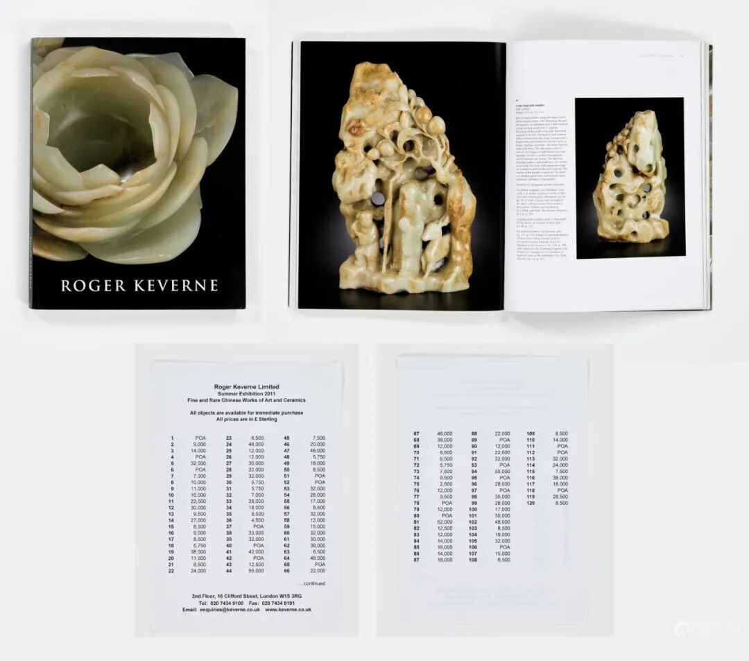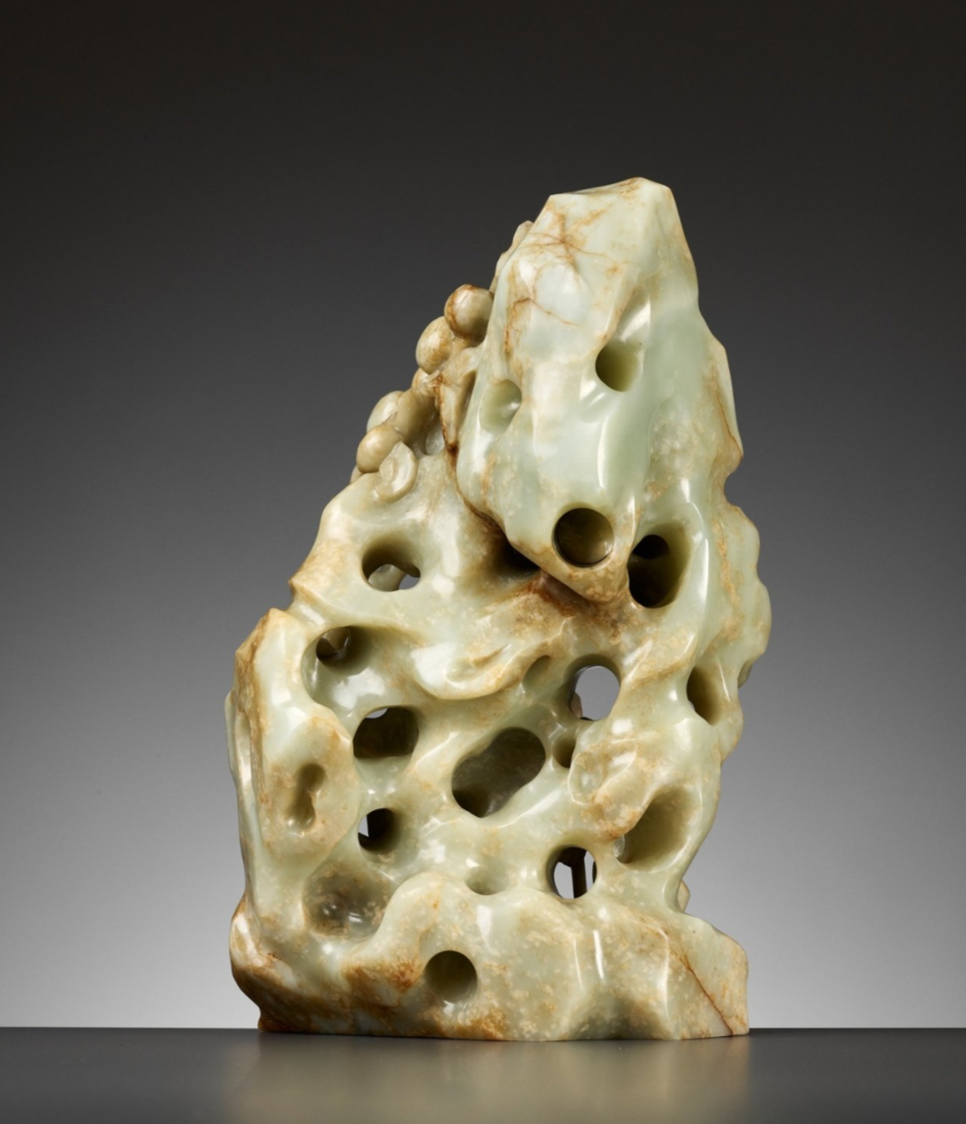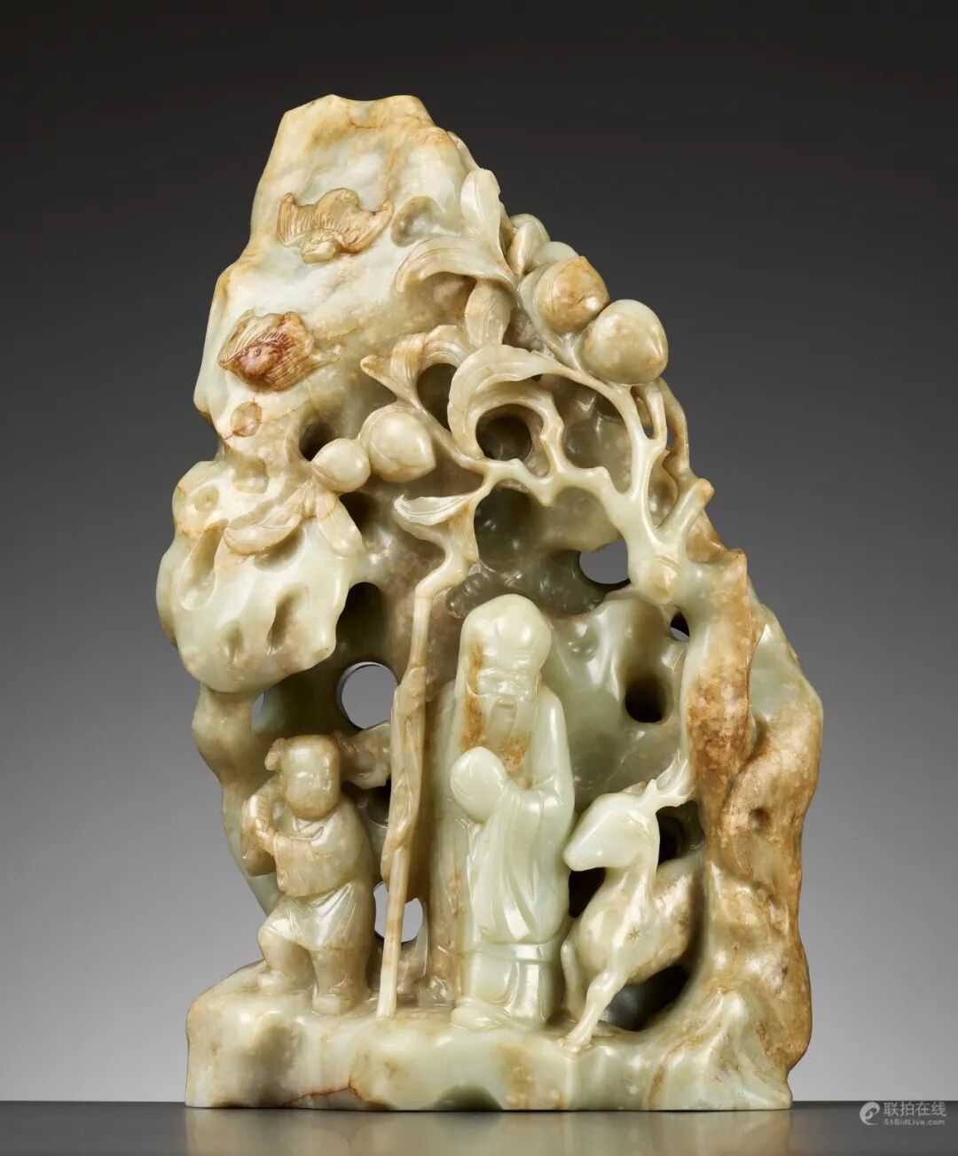 出版:Roger Keverne, Fine and Rare Chinese Works of Art and Ceramics - Winter Exhibition, London, 2011, no. 95. 展览价格单上显示了此拍品当时的价格,鉴于展览价格单上的价格是拍品的最低价格,因此可以推断这拍品的价格应该高于GBP 100,000。来源:意大利米兰知名私人收藏;米兰苏富比2010年10月19日 lot 31, 售价EUR 63,150 - EUR 77,960(换算成今日欧元价值);Roger Keverne 私人收藏,购于上述艺廊。备注:Roger Keverne 曾担任伦敦亚洲艺术协会主席和 BADA 总裁。他在 Spink & Son 开始了他50年的职业生涯,年仅28岁就成为亚洲部门的负责人。他于1992年离开 Spink,与他的妻子和商业伙伴 Miranda Clarke 在伦敦 Mayfair 成立了自己的艺廊 ,最终于2020年6月关闭。精美镂雕山岩下桃树旁立着寿老和他的侍从和一只鹿。桃树上硕果累累,两只蝙蝠飞舞,寿老左手持桃,右手持杖,他标志性的额头被技艺高超的玉匠打磨得极其润泽。乾隆皇帝在位期间,曾要求玉雕山子、山水牌匾、画板,都应藉鉴名家画作。本拍品清楚地体现了这一理念。玉是一种自古以来就象征着长寿和不朽。因此,它是一种特别适合用来雕刻道教仙人以及山水的媒介。这件山子的长寿主题非常明显,寿老和结著大桃子的树下的鹿,洞窟巨石的形状和巧妙的分层都有助于营造一种神秘的氛围,更加体现了神秘和不朽的仙道主题。