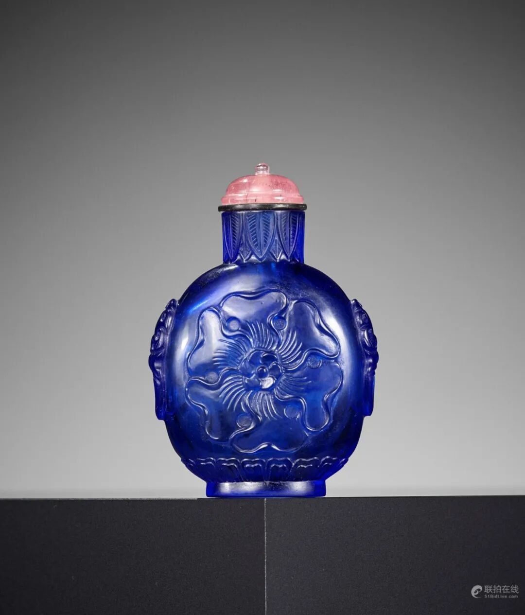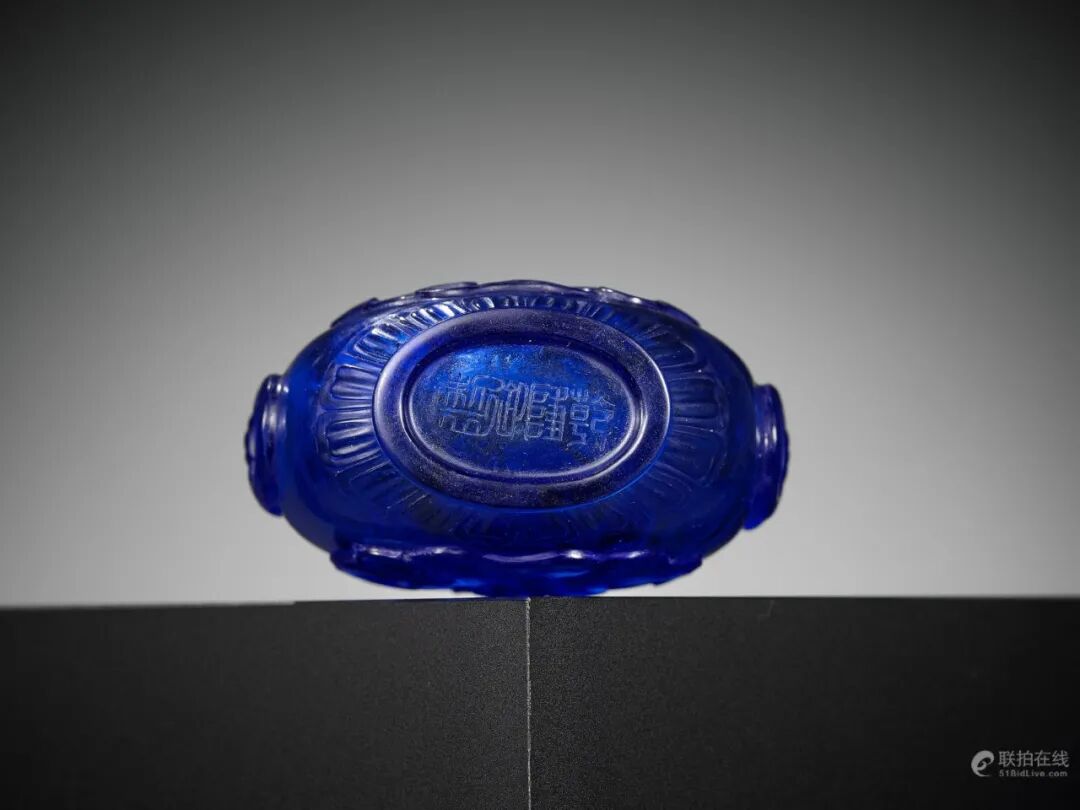 尺寸:含盖高 68 毫米 颈部直径 17 毫米 嘴部 9 毫米来源:美国伊利伊诺州伊凡斯顿 Halim Time & Glass Museum 美术馆收藏。直颈,椭圆形侧面,短圈足。瓶身两侧精雕细刻各一朵大锦葵花,边缘卷曲,两侧为辅耳和环柄,颈部蕉叶纹,足部上方有莲纹。透明玻璃呈低调而充满活力的深蓝色调,边沿和细节十分精美整齐。圈足内四字“乾隆御制“款。位于伊利伊诺州伊凡斯顿的 Halim Time & Glass Museum 美术馆于2017年开放,展示了1170多件玻璃及时计艺术品。这个美术馆由 Cameel 及 Hoda Halim 创立,同时也展出 Louis Comfort Tiffany 的作品。