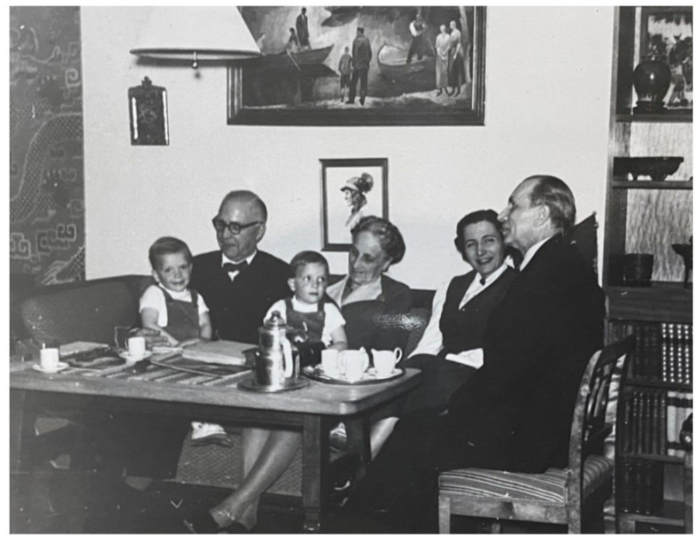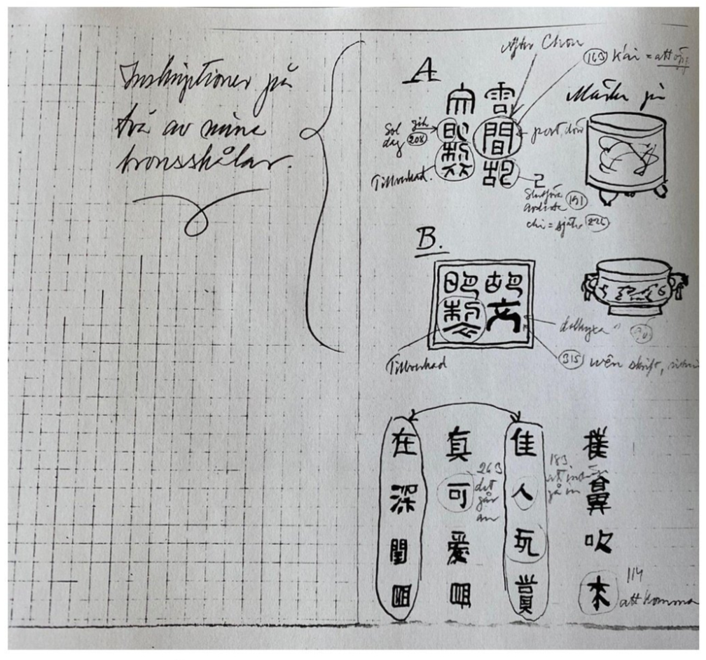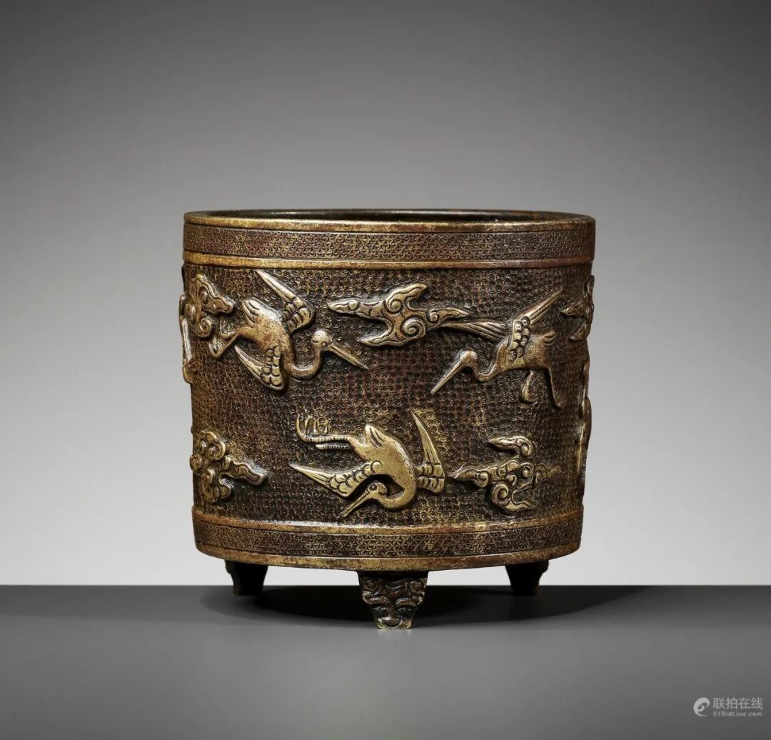 铜炉圆柱形,三兽首足。炉壁中部祥云纹地,鎏金雕飞翔仙鹤与如意祥云,姿态丰富。炉底篆书“云间胡文明制”。Ake Virgin (最右侧)与其家人(拍摄于1955年)。Ake Virgin(1891-1978)是一位瑞典土木工程师,他对中国艺术,尤其是早期青铜器有着浓厚的兴趣。他于1940至1970年代间构建了自己的藏品体系。Ake Virgin是斯德哥尔摩东亚美术馆馆友协会非常活跃的成员,并与著名的瑞典学者(如 Bernhard Karlgren 教授和 Orvar Karlbeck)有过多次讨论交流。随附一份 Ake Virgin 手写注释副本,将此炉款识与另一件胡文明款进行比较。