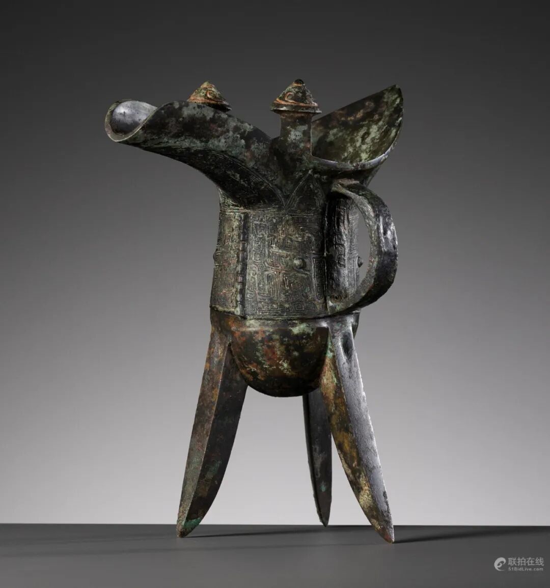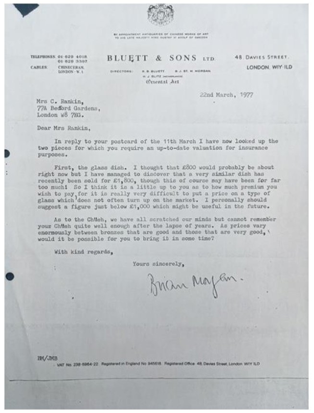 Galerie Zacke 提供了出版物、保险清单、藏家说明、旧发票、科学检测报告等详细资料,为这些拍品的来源提供了明确且全面的信息。来源:伦敦Bluett & Sons艺廊,约 1960 年或更早。伦敦私人收藏,购于上述艺廊,保存至今。1.Bluett & Sons 是中国艺术品的重要经销商,艺廊由 Leonard 与 Edgar Bluett 兄弟共同创立,后来由 Leonard 的儿子 Roger Bluett 继承。2.此拍品可在1977年3月的一份保险文件中找到。随附一份两页的清单副本,当时写着 “Chueh”, 价格为 GBP 2,500 (相当于现在的 GBP 40,000-60,000 ), 单子上都写着藏品的最高价格。随附一份 Bluett & Sons 艺廊的 Brian Morgan 写的信,时间为1977年3月22日。Morgan 回复爵的持有人关于保险最新估价,“cannot remember [the present lot] well enough after the lapse of years”(多年后记不清)并问是否可以买回来。这表明购买应该是在 1977 年之前至少 10-15 年前进行的,表明购买日期为 1960年前后。此器圆腹,一侧的口部前端有流——倒酒的流槽,后部尖状尾,流与口之间有立柱,腹部一旁有把手,杯腹一侧有鋬,呈兽头衔环状,下有三个锥状长足。三足高大细长外撇,刀状。颈部蕉叶纹,流下雷纹地蕉叶纹,腹部饕餮纹,把手一侧的腹部有两个字符,可能为家族标记,整体器形线条流畅。爵在商朝仪式中至关重要,它们是商墓中发现的数量最多的器皿之一,用于加热和倒酒,也可能用于饮用酒。本拍品是一件很独特的爵。与后世的不同之处在于有氏族印记,纹饰清晰,流和颈部下饰有蕉叶纹,刀形腿更高更锋利。一般来说,后来的类型通常比此拍品更小,而且精致得多。在妇好墓中发现了类似的器皿,表明其时间为安阳时代(公元前 1300-1050 年)末。见Robert W. Bagley, Shang Ritual Bronzes in the Arthur M. Sackler Collections, 第1册, The Arthur M. Sackler Foundation, Washington, D.C., 1987, 第182页,图12.1, 以及第185页, 图13。此类爵相比于后来的如佳士得或苏富比2000年之后的拍品,保存完好,十分珍贵。本拍品随附一份 Bluett & Sons 艺廊Brian Morgan 所写信件Brian Morgan (左侧)和 Roger Bluett (右侧)在Bluett & Sons 画廊,1977年