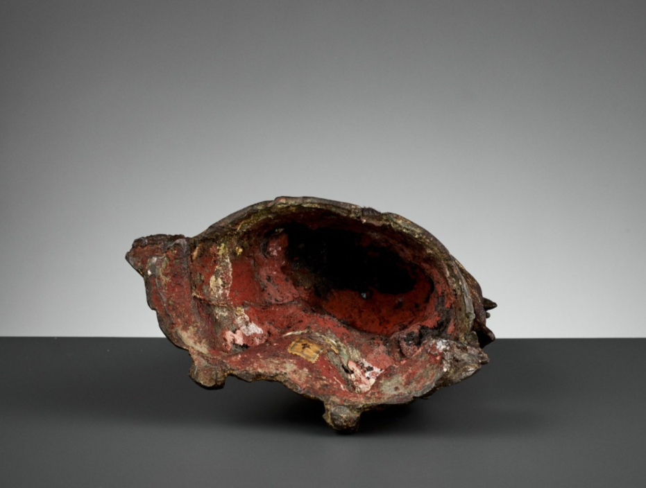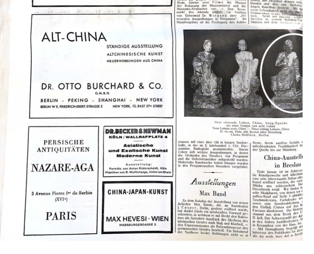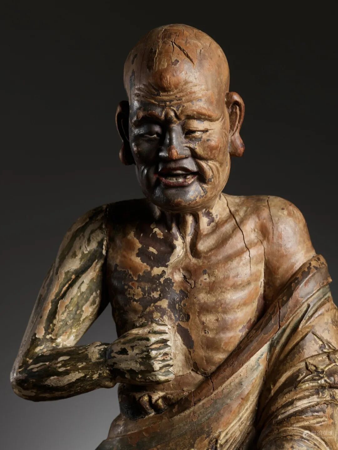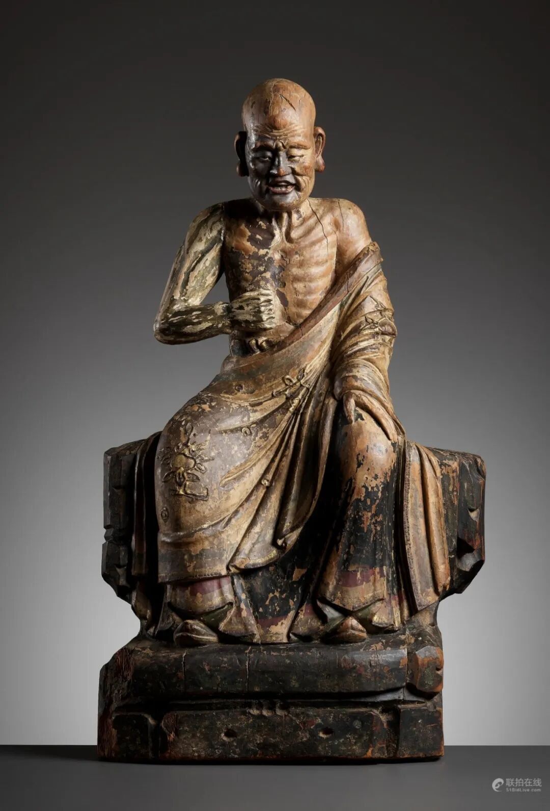 出版:Weltkunst(世界艺术), 1931年2月15日,第5册, 图 7, 第 8页 (与另外两件来自宋代的罗汉像,一共为八罗汉)。来源:柏林 Theodor Bohlken 收藏,1931年。德国 Bernried 的Georg L. Hartl 收藏,萨尔斯堡的私人收藏,购于上述收藏。精雕细刻,罗汉以从容的姿态坐在石座上,右手攥在胸前,左手搭在膝上,左肩披着宽松的天衣,袒右肩,露出嶙峋身体,石膏浮雕花卉纹。沉静的脸庞,眼皮微垂,皱纹沟壑,嘴巴微开。Theodor Bohlken(1851-1954)曾是 20 世纪上半叶著名的中国艺术品经销商。其商铺的第一层售卖茶叶,上面三层陈列著从魏到明的佛教雕塑、从汉代到晚清的中国陶瓷,以及日本的艺术品。其客户主要是出差到柏林的私人收藏家。在科隆的东亚艺术博物馆和柏林的亚洲艺术博物馆中都有来自 Bohlken 的物品。出版:Weltkunst(世界艺术),1931年2月15日。