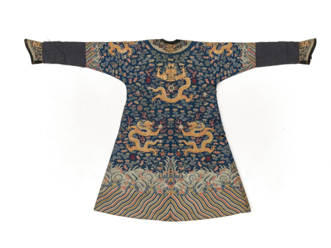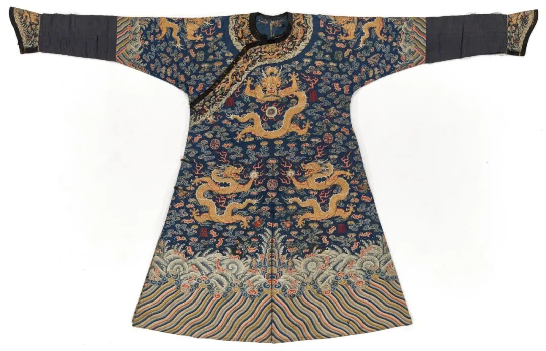 来源:塞尔维亚诺维萨德 Alexander Popov 私人收藏,购于1900-1920间。绣蓝地纳纱金线九龙纹,其中一对金龙戏珠,而其他七条则各抓一枚火珠于掌中。