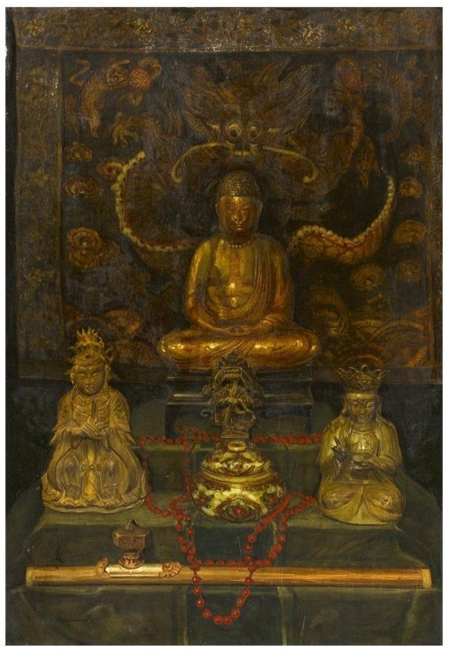 尺寸:高 27.5 厘米 (不含底座),总 32 厘米来源:Klaus Clausmeyer 收藏,在同一家族保存至今。元君面容慈祥,头戴精美的凤凰头饰,双手捧著一块圭,身着一件飘逸长袍,花边细节精美,胸前与肩部饰有如意形饰物。Klaus Clausmeyer(1887-1968)曾是一位德国画家。第一次世界大战期间,他被困于比利时,机缘巧合,一尊佛头滚至他的脚边,启发了他对佛教艺术的收集。他后来把收藏的重点放在了非洲和大洋洲的艺术品上。如今,其大部分藏品入藏科隆 Rautenstrauch-Joest 博物馆。上图所示为 Klaus Clausmeyer 的画作,其中前排左侧为此拍品。