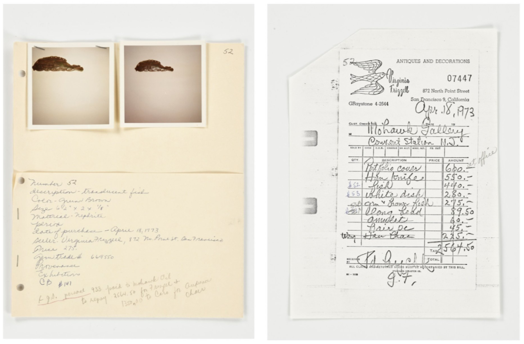 来源:旧金山 Virginia Frizzell 艺廊,1973年4月18日。新泽西 Mohawk Gallery 艺廊,购于上述艺廊;纽约私人收藏,购于上述艺廊,保存至今。1.背面有三个老标签,分别注明 ‘52’, ‘3368’, 与 ‘CB 147’。2.随附原始 Virginia Frizzell 发票 ,时间为1973年4月18日,此拍品为 ‘#52 Fish’,而 Mohawk Gallery 是顾客的发票复印件。3.随附私人藏家手写注释复印件,注明收藏编号为 52,材料为和田玉,购于1973年4月18日,GIA 报告编号为 669550, 并此拍品的两张柯达照片。佩身扁平,鱼形,翘嘴,嘴里衔著一枝树枝,边缘薄削,背鳍镂空穿孔用以悬挂,鱼肚有第二个悬挂孔。鱼眼大而圆,鱼身表面有三角纹装饰。青绿色调的半透明玉料,带有大量的赤褐色和黑色斑点。本拍品随附私人藏家手写注释复印件(左),以及原始 Virginia Frizzell 发票(右)