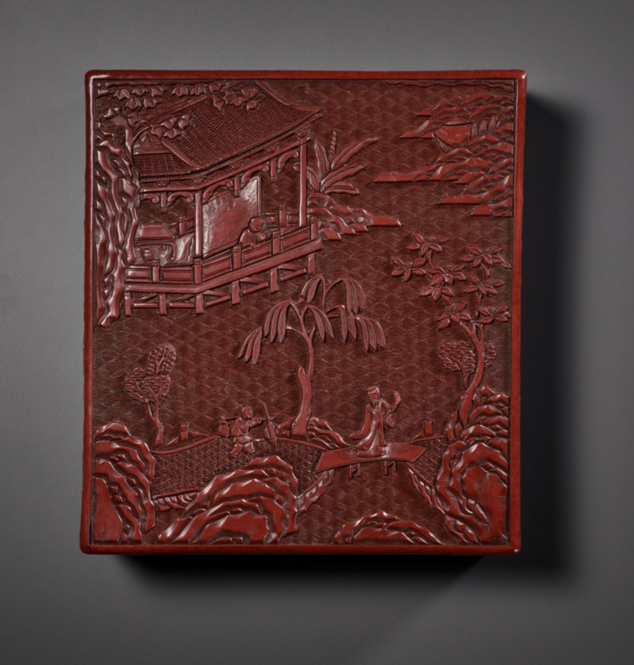 来源:Mee-Din 与 Robert W. Moore 中国漆器收藏。方盒盖剔红雕刻人物场景,近处一文士拄著拐杖过桥,从仆挑着雨伞和行李箱紧随之后,周围杨柳依依,树木岩石环绕,桥下锦地纹描绘水波。对岸亭子内站着一人观望着岸这边,他身后有一个大屏风和家具。Robert W. Moore (右侧)是加州著名的中国和韩国艺术收藏家,他的收藏热情始于 1950 年代。当时他在美国军队服役并驻扎在韩国。回到美国后,他开始收藏韩国和中国的艺术品,尤其是漆器,在之后几十年里,他成为了一位知识渊博、眼光敏锐、影响深远的收藏家。