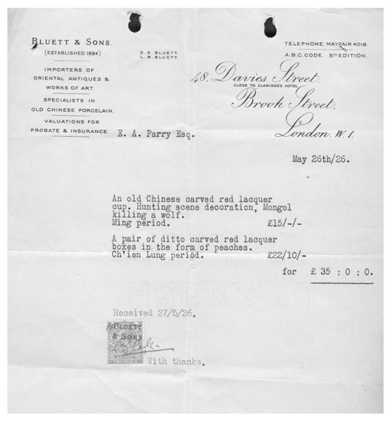 本拍品随附 Bluett & Sons 艺廊出具的盖章发票副本