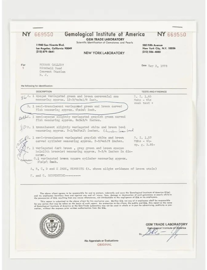 随附由 Gemological Institute of America 提供给 Mohawk Gallery 的报告