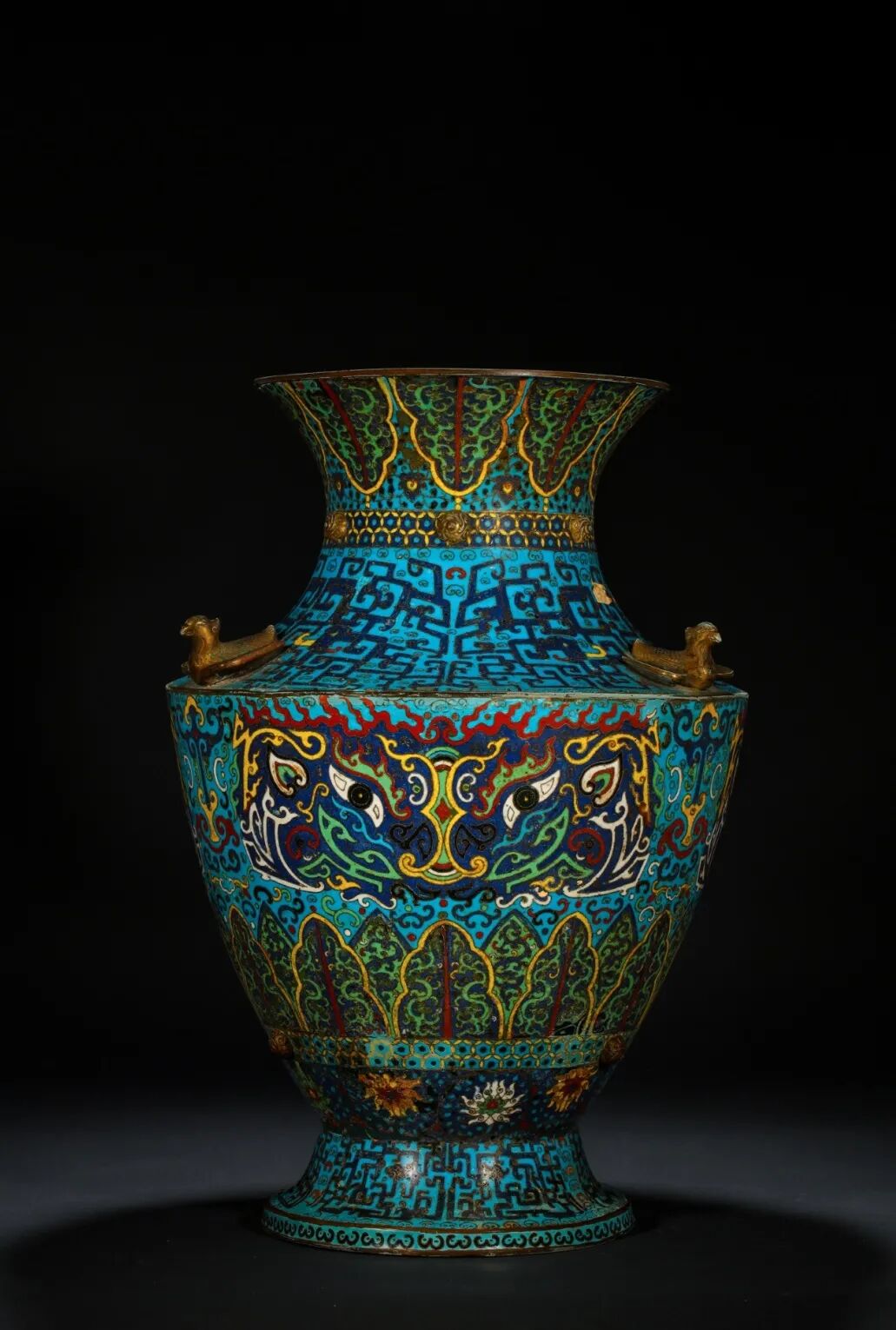 清早期至乾隆朝為琺瑯器製造的鼎盛期,康雍乾三代皇帝崇尚師古,因而製作出許多仿古而製的琺瑯作品,本品即為仿商代青銅罍一例。器身饕餮紋色彩華麗,紅黃藍綠白交相輝映,線條描繪細膩,與肩部飛鳥呼應,更添威嚴神秘之感。整器流光溢彩,華美富麗,圖案佈局得宜,繁複緊密而不見淩亂,釉彩過渡自然而首尾相得益彰,具有濃重的宮廷色彩和皇家氣息。