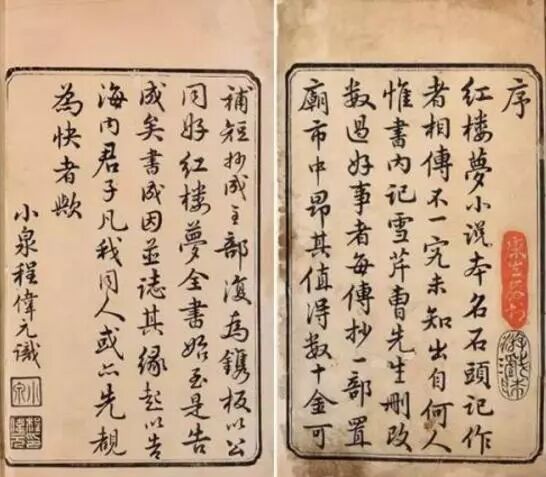 3、程伟元、高鹗是根据他们搜罗到的在社会上广为流传的八十回抄本和一百二十回抄本整理、刊刻的一百二十回刻本,即刻本的底本包括了一百二十回抄本。
