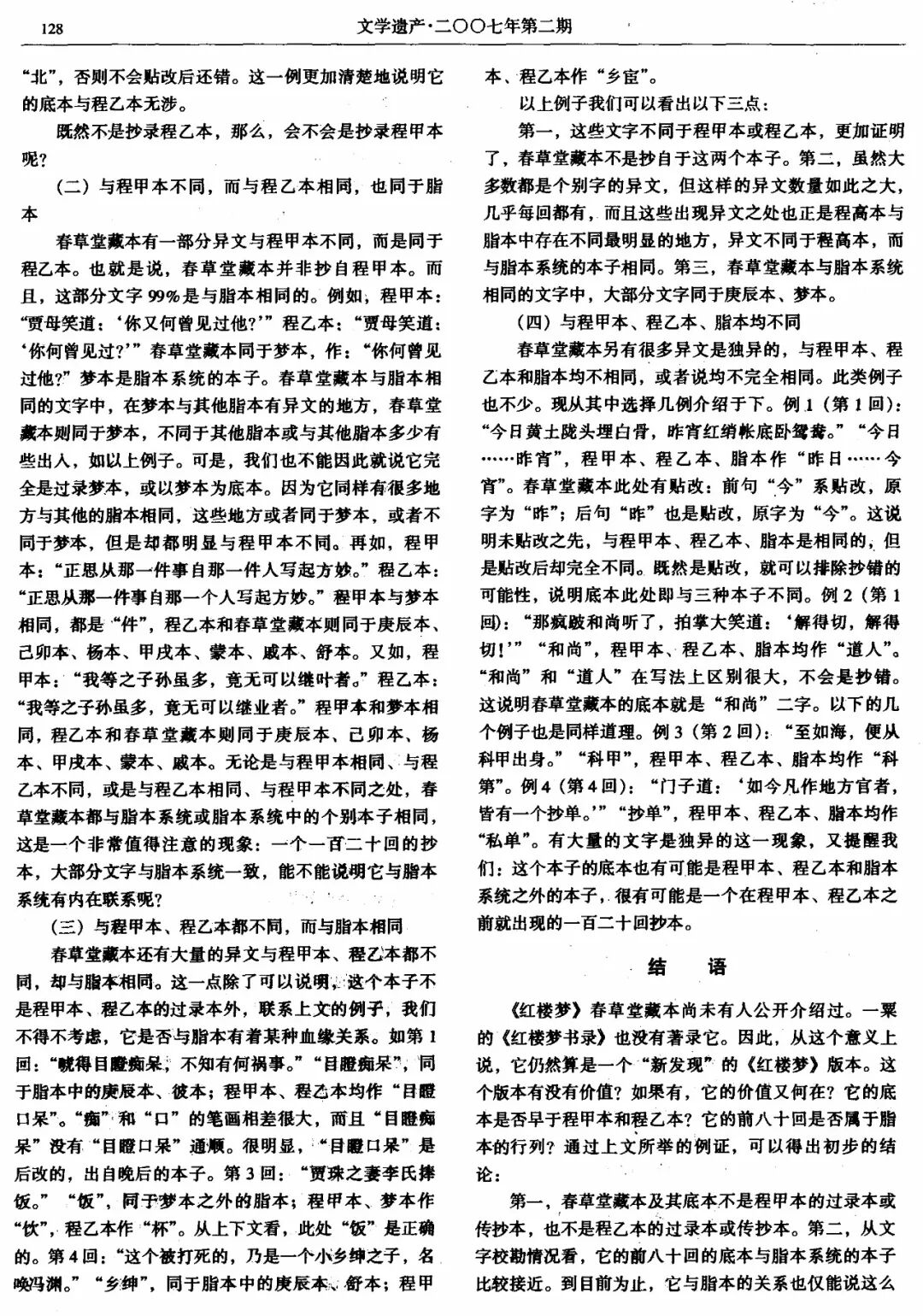 《文学遗产》2007年第2期载夏薇《<红楼梦>春草堂藏本》