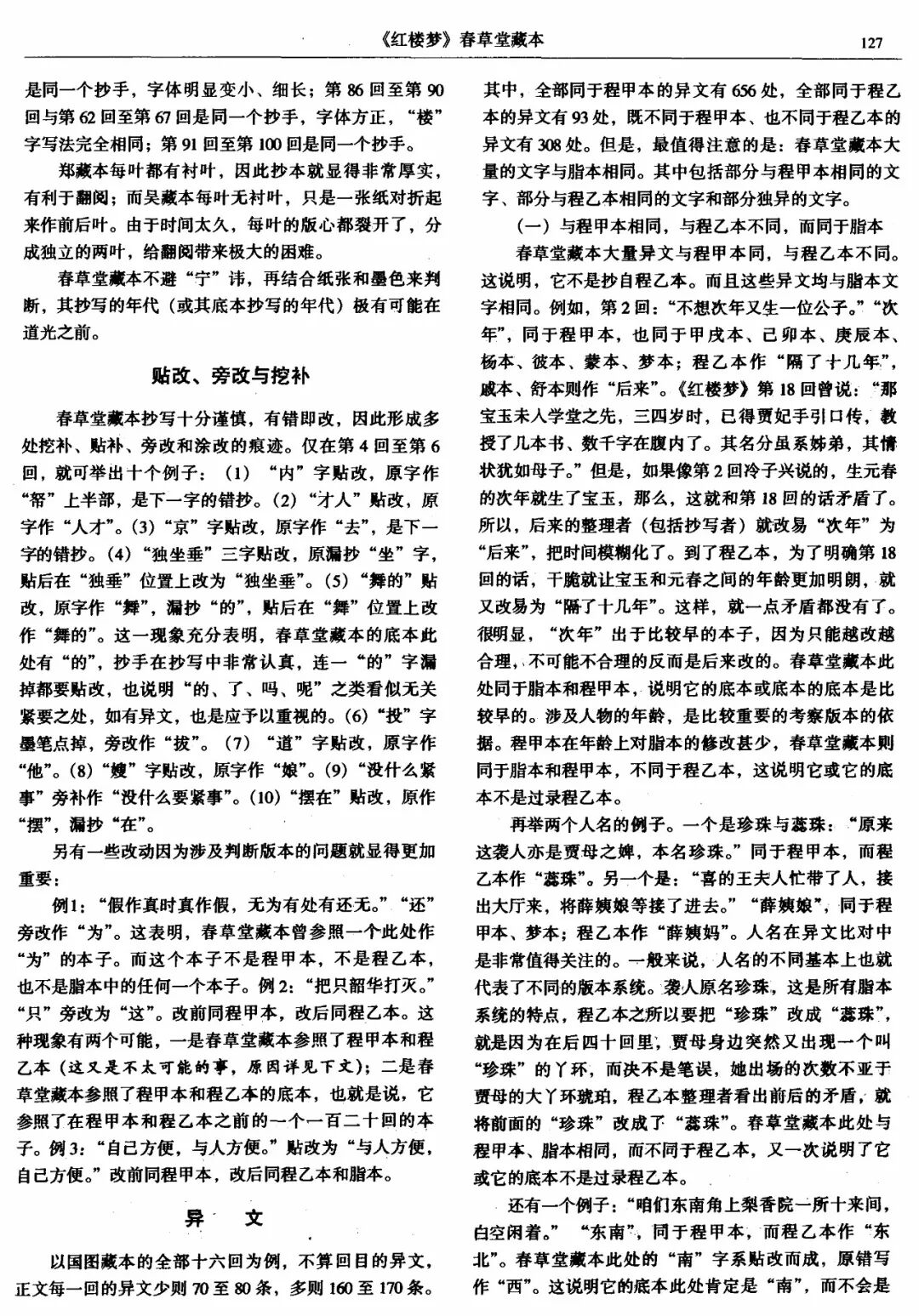 3、异文的大量存在。如果是抄程本以后的刻本便不会有如此之多的异文,120回本中出现的异文整理出来,决不亚于,文化艺术出版社出版的5大本《脂砚斋重评石头记汇校》本中80回抄本的异文。异文如此之多,说明传播的时间长,范围广,决不可能在程刻本已经分去了一大部分读者的情况下,社会上还会有这么多抄本和这么多异文存在。