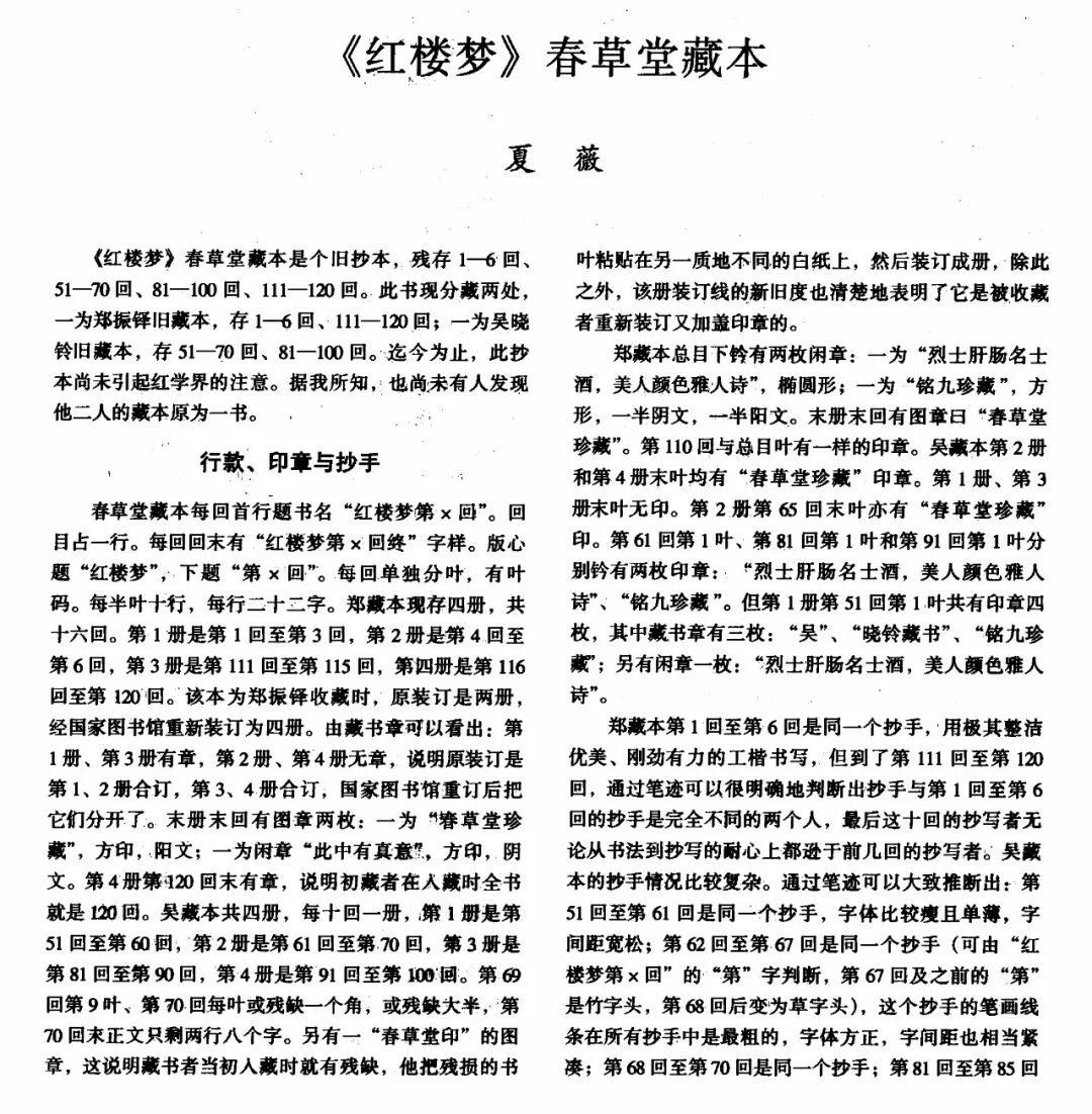 编者按:夏薇著《<红楼梦>春草堂藏本》一文首发于《文学遗产》2007年第2期;随后,中国社科院文学所“百年红楼梦”网站转发(发表时间标为2008年9月12日),标题改为《<红楼梦>春草堂藏本初论——<红楼梦>120回抄本系列研究之一》,本文即转载自该网站。虽然该网文文末注明“原载:《文学遗产》2007/02”,但仔细比较发现,该网文比《文学遗产》刊载的内容扩充了几倍,尤其是例证更多。