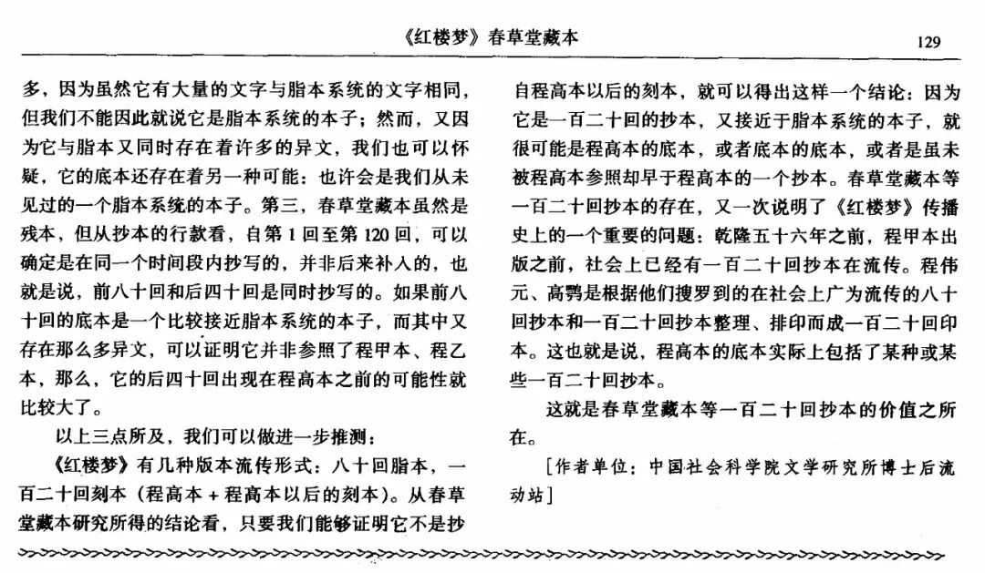 迄今为止,《红楼梦》版本研究大都集中在脂本研究和程本(120刻本)研究上,对于120回抄本的研究可以说是几乎没有,所以这是一个全新的研究领域。