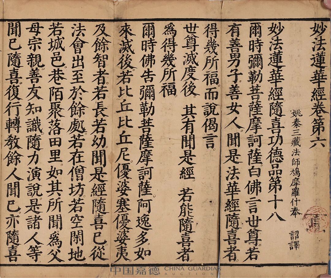 “古籍善本 金石碑帖”专场包括历代佛经典籍专题,自北宋金粟山藏经、南宋、元代单刻佛经,直至明清刻本藏经,其中尤以南宋常州宜兴县广福利益寺比丘本性刻本《观音忏法》、元至元二十九年(1292)江西抚州宜黄县朱妙静施刻本《妙法莲华经七卷(存六七两卷)》最为罕见。北宋写本金粟藏经帖、元明刻经及泥金写经大放异彩。此外,清宫旧藏奏折及档案专题汇集清代宫廷朱批奏折、中外关系档案等四十余种,大字本古籍专题收录诗文等题材现代珍本近三十种,首次以系列面貌整体推出。金石碑帖除商周毛公鼎、散氏盘之外,张伯英题跋明拓北魏张猛龙碑可称翘楚。