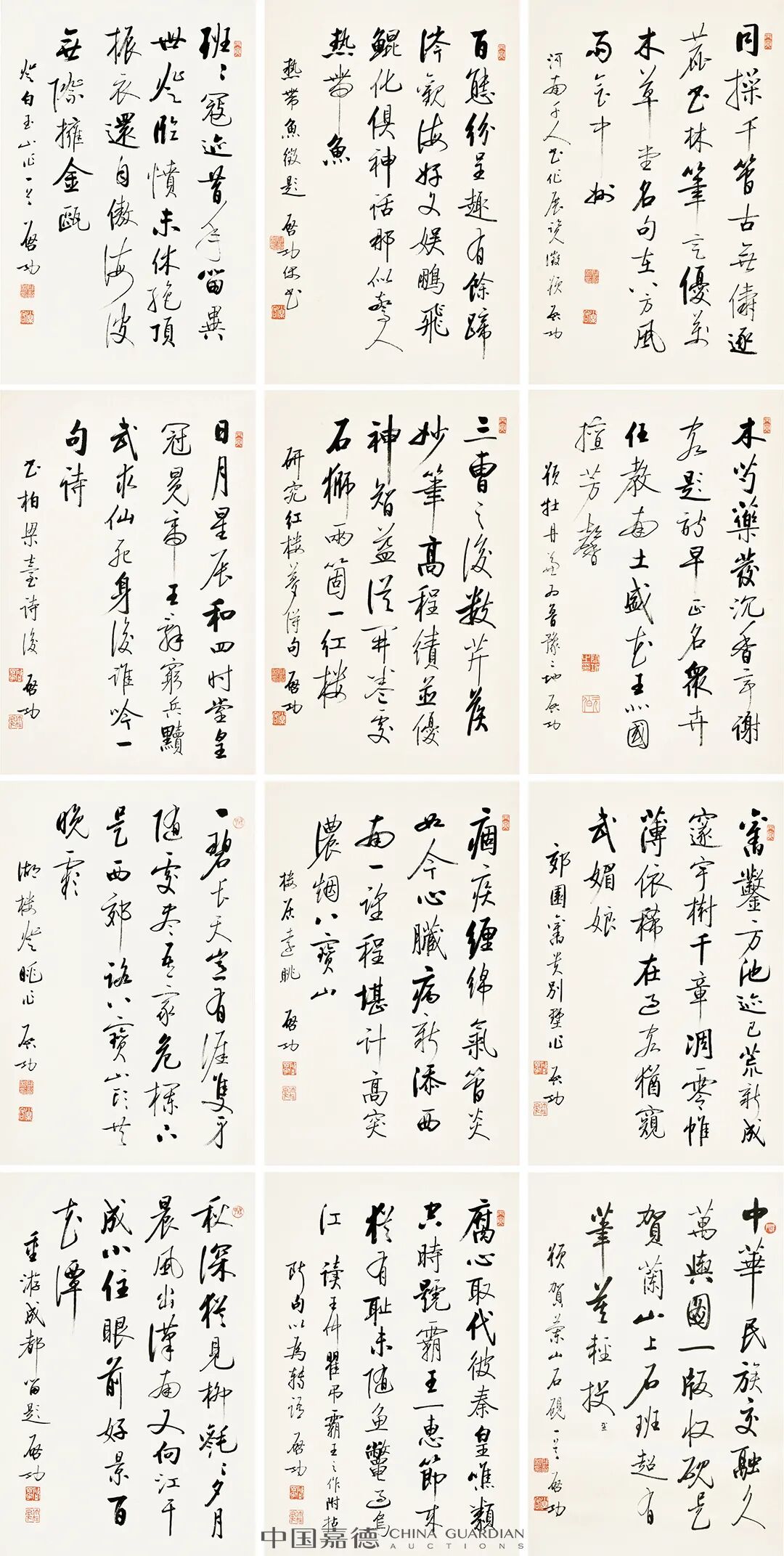 “浮光掠影——启功先生旧藏”专场集得先生旧藏书画作品80件,分为两部分:其一为启先生作品50件,条幅、中堂、横幅、对联、屏联、手卷、成扇尽有之,同时大部分作品在《启功全集》、《启功书画集》中都有出版或著录,其中不乏先生创作之孤品,如行书自作诗十二屏、为福建梅峰寺大悲殿书二十一言联、临宋黄庭坚青衣江题名卷、古体诗十二屏等,弥足珍贵。其二为近代名家赠与启功先生扇面,共30件,皆为民国时期书画界之栋梁。