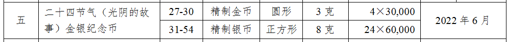 二十四节气纪念币是今年比较特殊的一个项目。这组纪念币将发行4枚3克金币,以及24枚8克银币。![]()