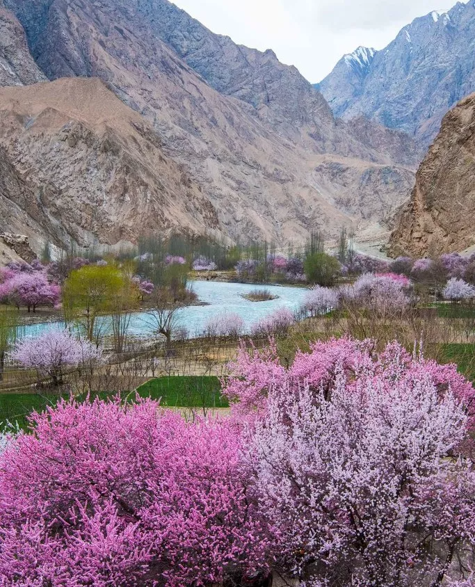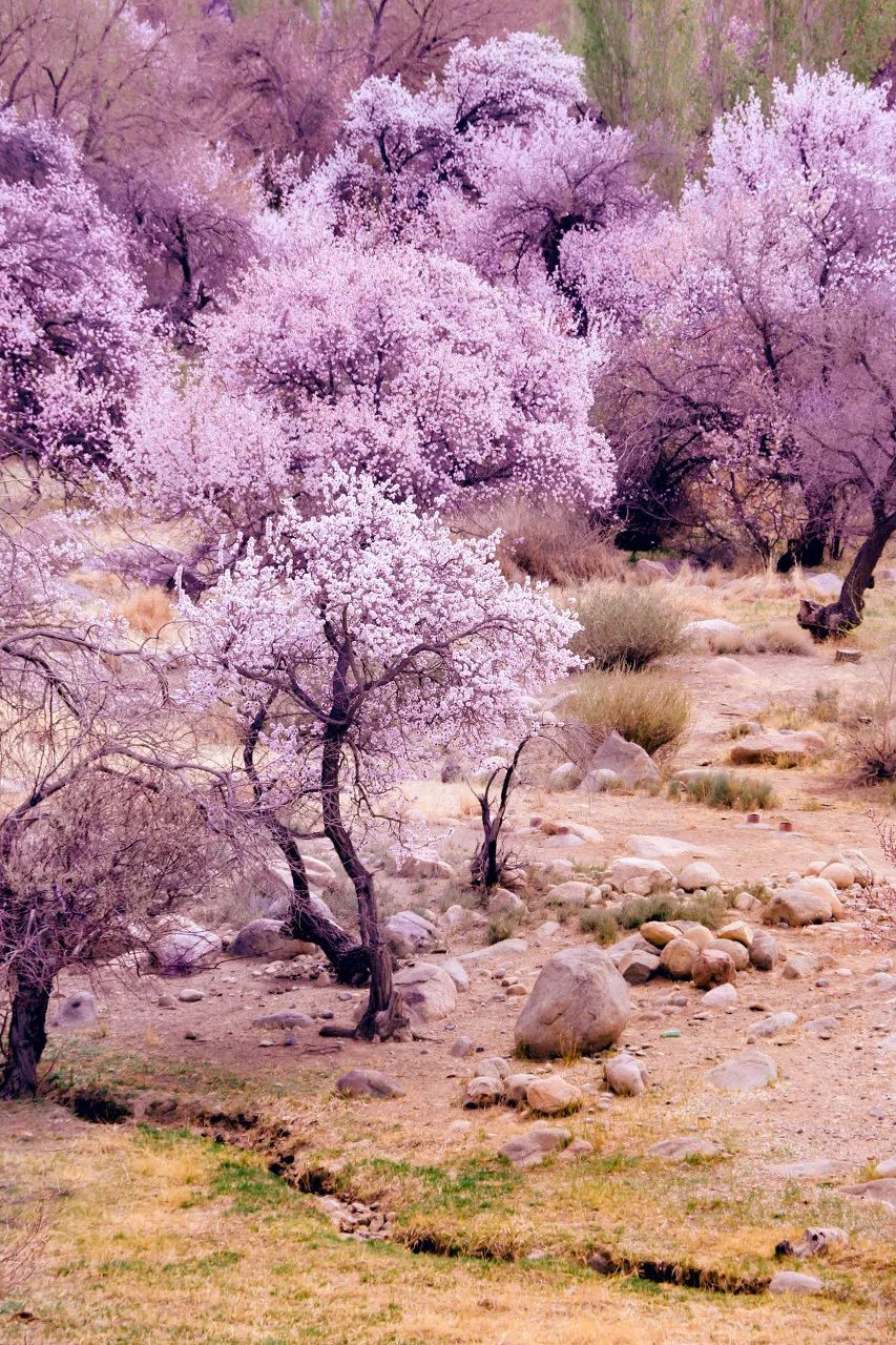 怪不得,在盘龙古道上流传着这么一句话:“今日走过了人生所有的弯路,从此人生尽是坦途”。后来,连春天都放弃了在南方地区的矜持,大大方方的在这里登陆,开放出一篇醉人的粉霞花海。尤其是库科西鲁克到大同乡的河谷一带,枝干虬生的杏树张牙舞爪地伸向路中,竞相绽放花朵,漫山遍野便是如云霞般的花团锦簇。风沙,乱石,荒原,却处处有蓬勃的生机。3月中到4月初是杏花花期,每年从花开到花谢只有20天左右的时间,错过再等一年彼时,整个帕米尔高原俨然是抛却了高山峡谷的圣洁,绽放出迷人的娇羞来。河道与悬崖间的深山峡谷里,每一处山涧的谷地、每一条奔腾的河床,甚至屋前屋后,无不是一处处如烟如雾的花影。