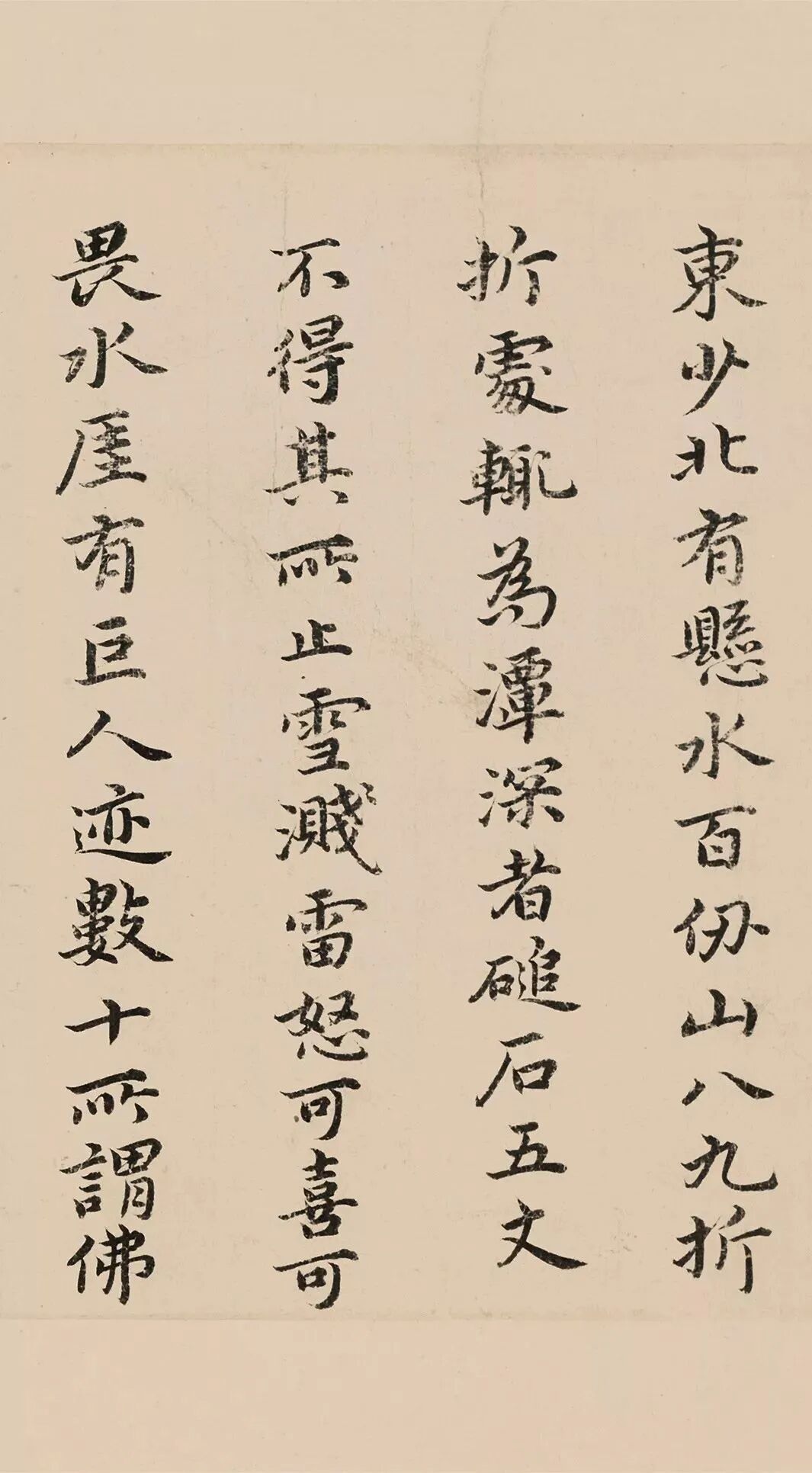【8】东,少北,有悬水百仞,山八九折,折处辄为潭,深者缒石五丈,不得其所止。雪溅雷怒,可喜可畏。水崖有巨人迹数十,所谓佛