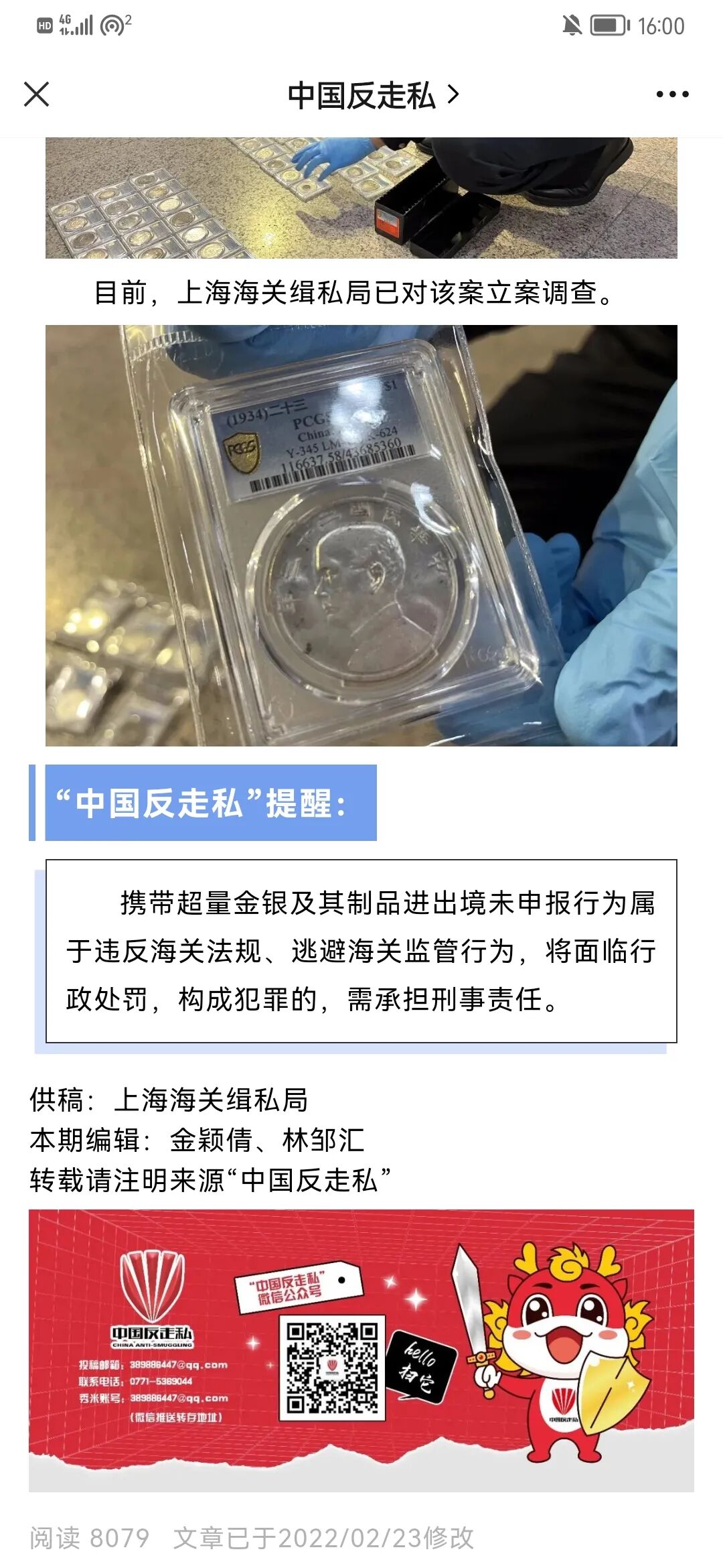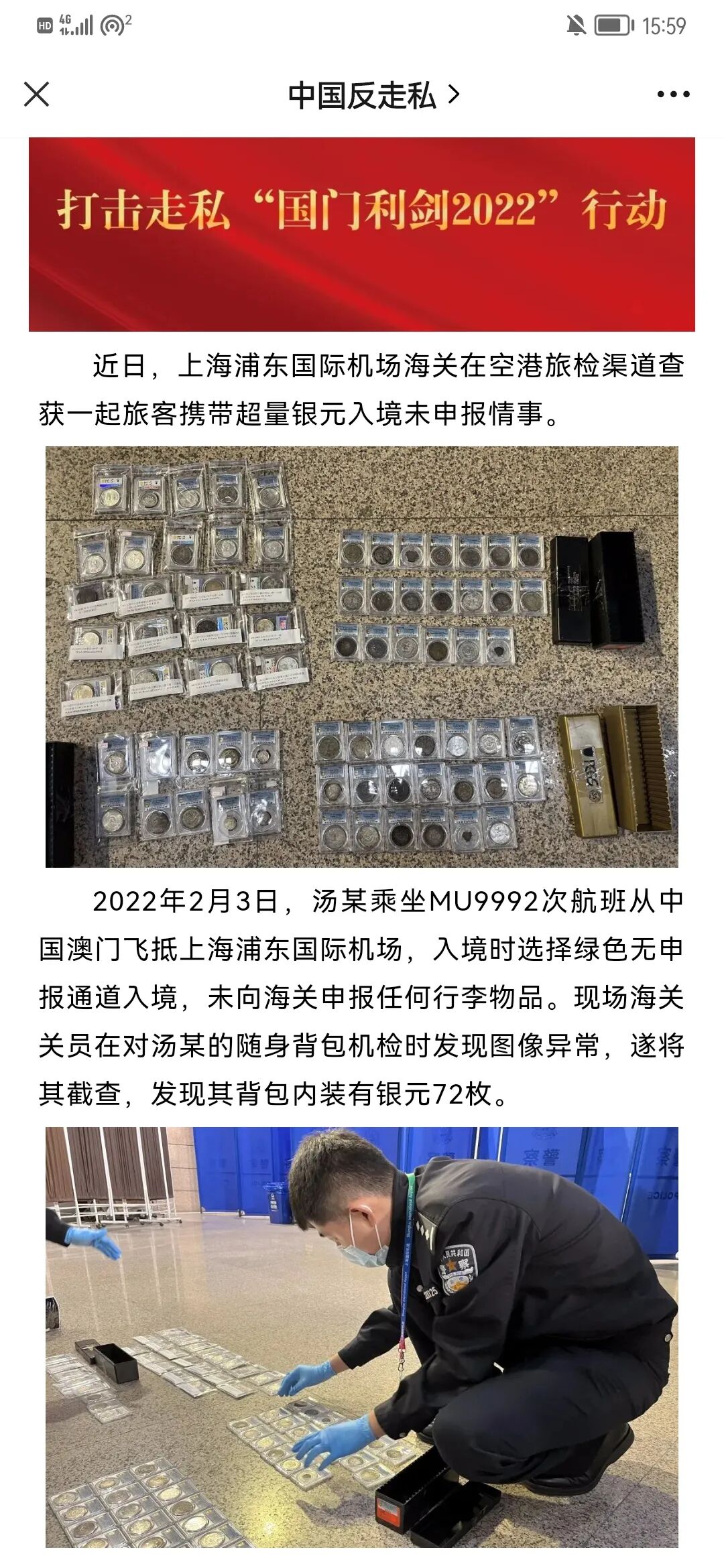 还记得2月3号,有人带一批72枚PCGS的银元入境,被上海海关查获,原因是:携带超量金银及其制品进出境未申报行为。相关新闻截图如下: