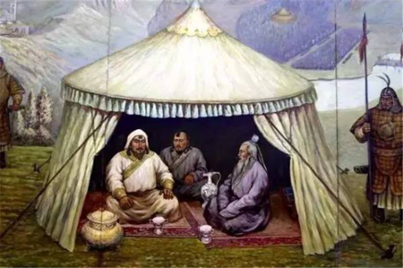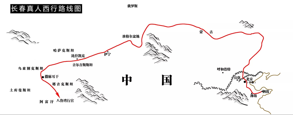 1219年,还在率军西征的成吉思汗,就遣使臣宣召丘处机。1220年正月,73岁的丘处机率尹志平、李志常等18位弟子,从山东莱州出发,于1222年四月初五在八鲁弯湾行宫(今属阿富汗)见到了成吉思汗。