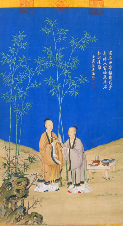 弘历的继任老师是翰林院掌院朱轼,讲授贾谊、董仲舒和宋代儒学,而后又请翰林院编修蔡世远继续为弘历教授四书五经、宋儒著述。蔡世远并不局限于书本知识,而是将这些理论与治国平天下结合在一起,探讨历史上治乱兴衰的规律,讲授为君之道。弘历自己承认,“于轼得学于体,于世远得学之用,于福敏得学之基”(《清史稿·福敏传》)。可以说,在遇到康熙之前,弘历除了上学之外,已经接受了父亲的1对1精品课程。当他被成功“鸡”成“牛娃”之后,与康熙爷爷的“偶遇”也就不远了。圆明园相遇后,弘历的小灶改到了皇爷爷处。他的表现依然争气,每次面对突击检查都表现自如。一天,康熙查问弘历的功课,让其背诵周敦颐的《爱莲说》。弘历信心满满,朗声诵道:“水陆草木之花,可爱着甚番......牡丹之爱,宜乎众矣。”康熙问弘历这篇文章的精神内涵,弘历已然理会“莲”的精神内涵。康熙十分心悦,盛赞弘历的才情与领悟。(唐文基、罗庆四:《乾隆传》)