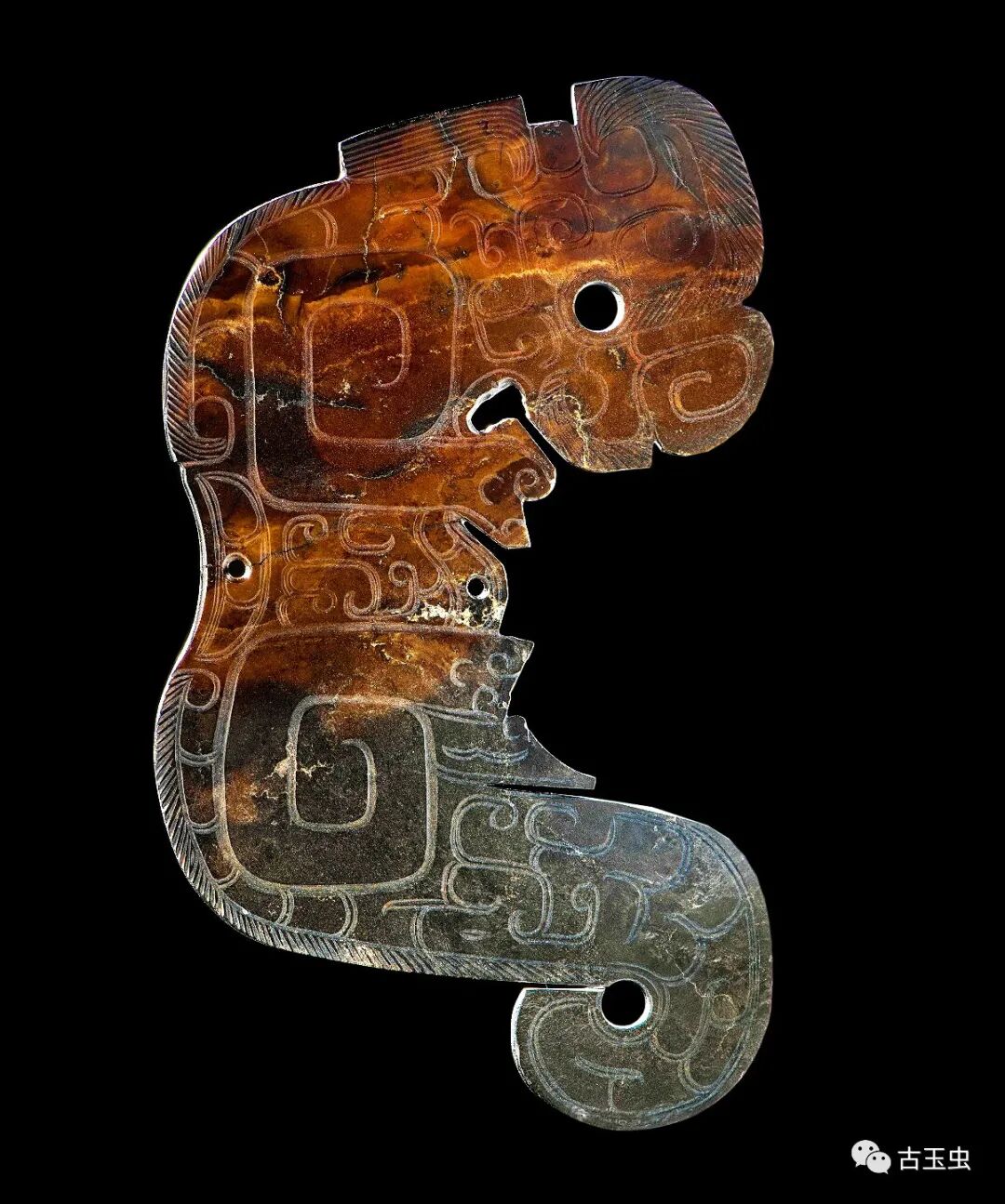 云龙纹玉虎 春秋时期 长14.4、宽8.4厘米 南阳市桐柏县月河镇左庄村墓M1出土,现藏南阳市文物考古研究所 说明:部分受沁呈褐色。片状。垂首、凹背、垂尾上卷。正面头部饰简化龙纹、绞丝纹;前、后部以宽大的云纹表示前、后肢;腰、尾饰简化龙纹;颈、脊背饰重环纹;外缘饰绹索纹。背面光素,头尾各有一较大穿,背腹各有一小穿。