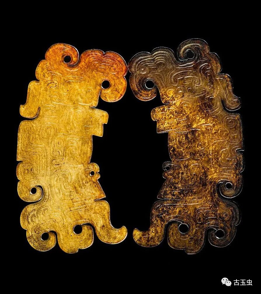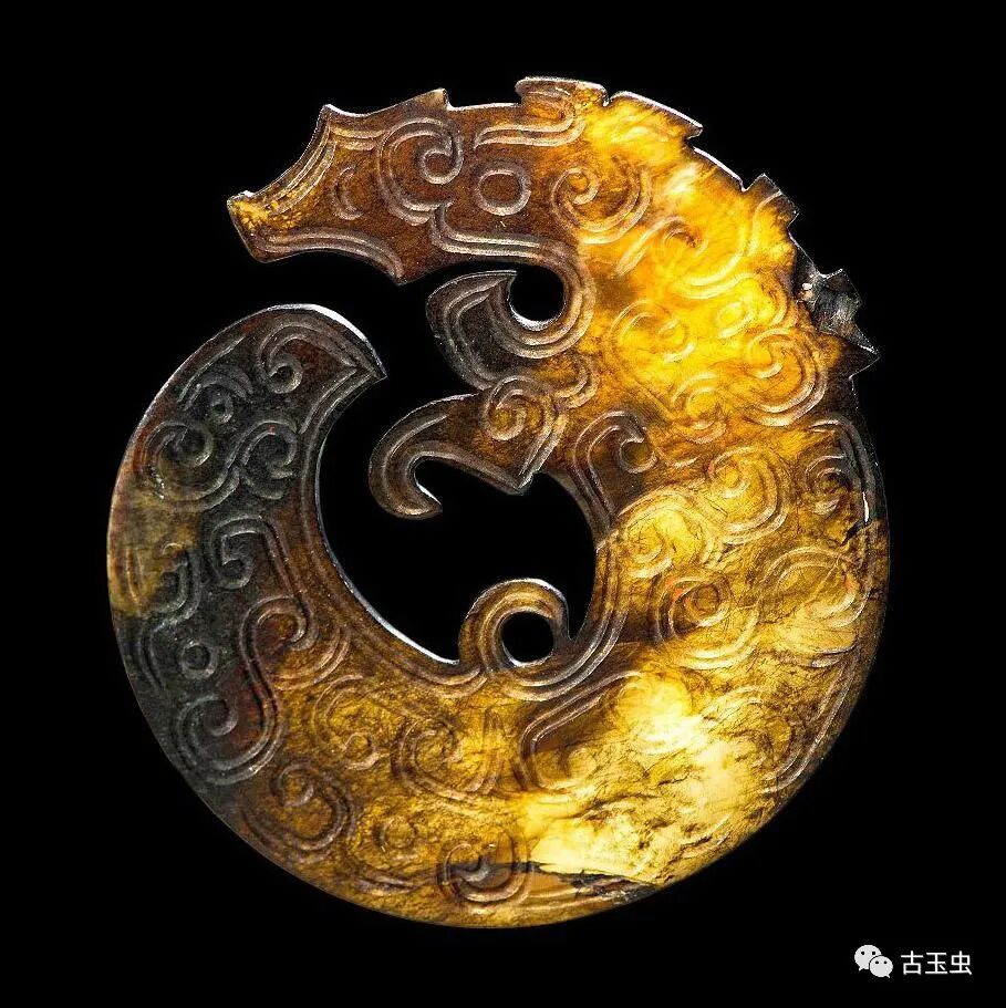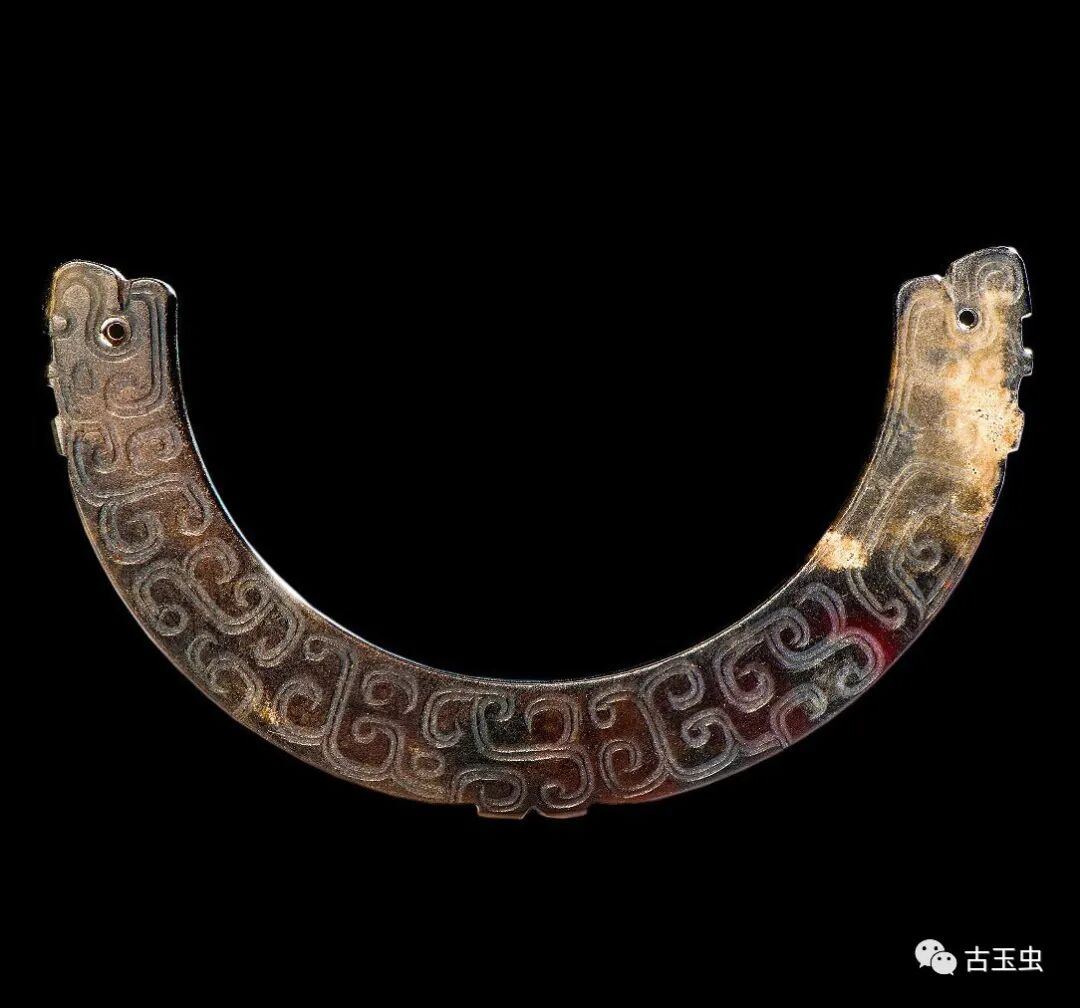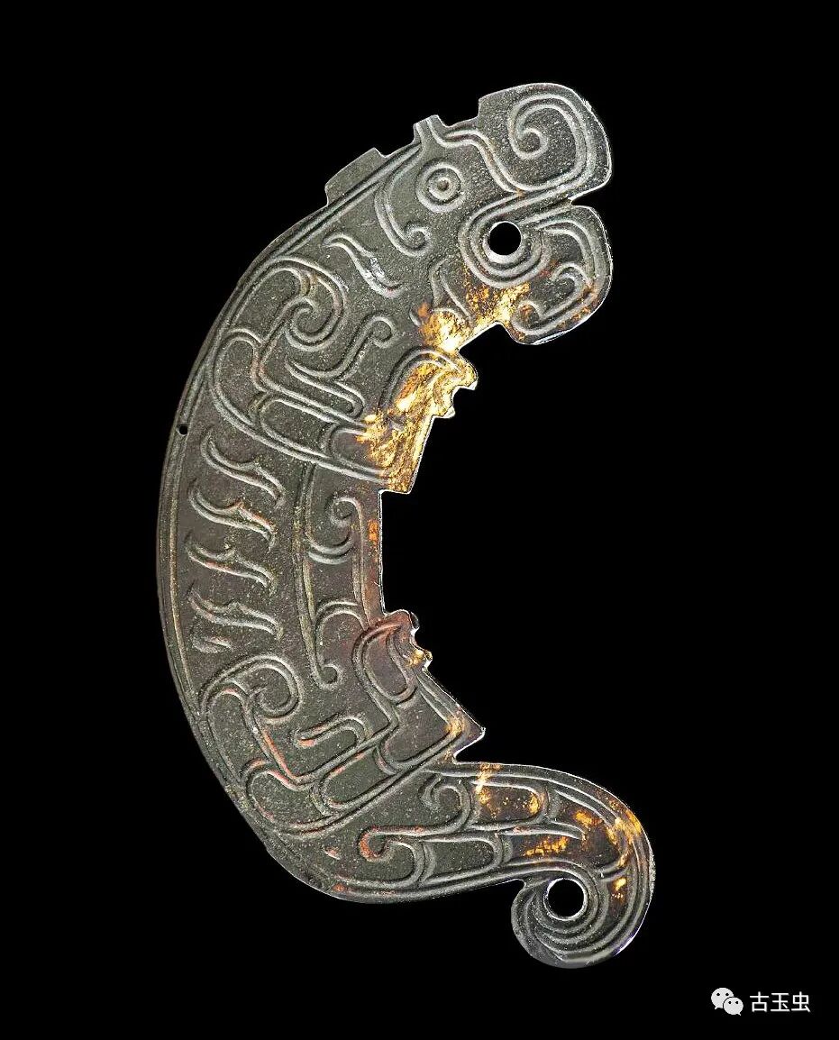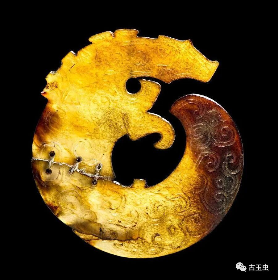 龙形玉玦 春秋时期 直径5厘米南阳市桐柏县月河镇左庄村墓M1出土,现藏南阳市文物考古研究所 说明:青白玉,温润细腻,质密微透。均有黑漆古。片状,为团屈龙形。背面光素。玉龙椭圆形目,有角,侈纹,长舌上卷,尾屈卷与口相对。两器为一玉对剖。其一身饰五个龙头,一个简化龙头。另一残,身饰四个龙头,一个简化龙头。从短处纹饰不连贯推知,为器未琢成时断裂。