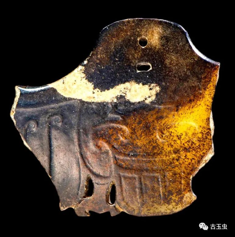 玉鹰残块 石家河文化 残高6.5、残宽6.8、厚0.7厘米 南阳市麒麟岗西汉墓M8出土,现藏南阳市博物馆 说明:白玉。表面多黑漆古和灰白色沁斑。正面用减地阳线法雕一立姿展翅状鹰纹。左翼上部有尖状凸起,并有三条豆芽状的翎纹。右翼仅存上端尖突少部。胸部饰“山字”形纹、云纹。下垂鸟尾。尾侧有粗壮有力的左腿及如勾的脚爪。头部,右足残缺。颈部二穿似后人所为。背面光素。