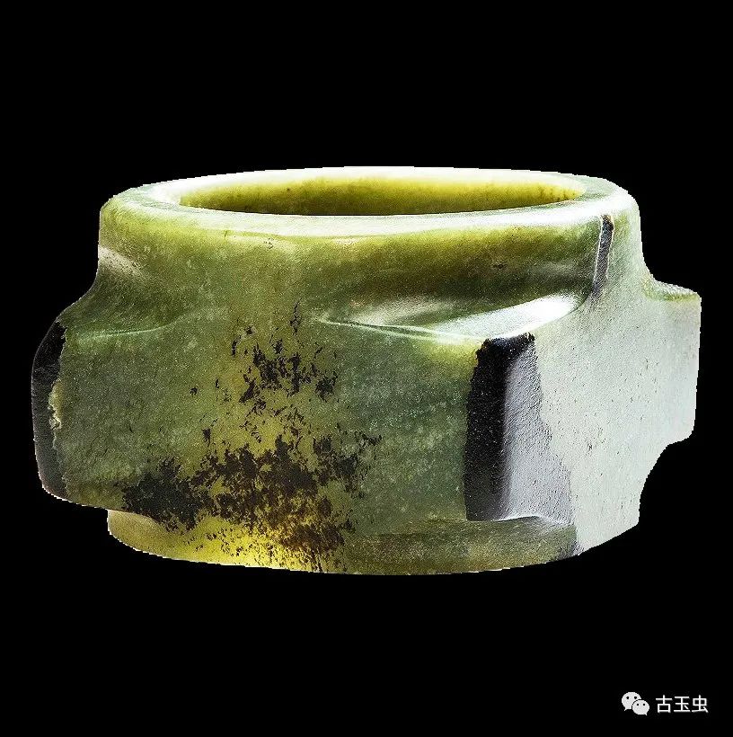玉琮 春秋时期 高4.2、宽6.7、内径5.5厘米 南阳市物资城墓M1出土,现藏南阳市文物考古研究所 说明:透闪石,青色,部分受沁呈黑漆古色,通体磨光。内呈圆筒状,外方,上、下有射。系旧玉切割改制而成。