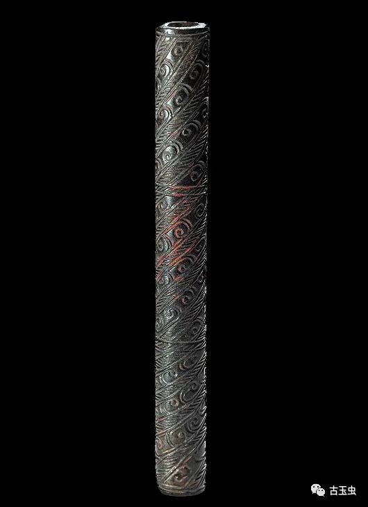 玉管 春秋时期 长10、直径1.1厘米 南阳市桐柏县月河镇左庄村墓M1出土,现藏南阳市文物考古研究所 说明:蚀变岩。黑色。圆柱状。卷云纹与集束短斜线纹相间,分三段呈螺旋状饰与器表。器中部一侧有一穿与纵向穿贯通。