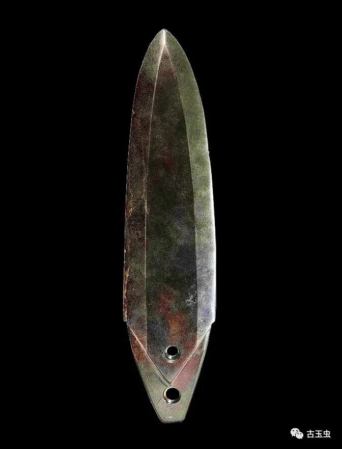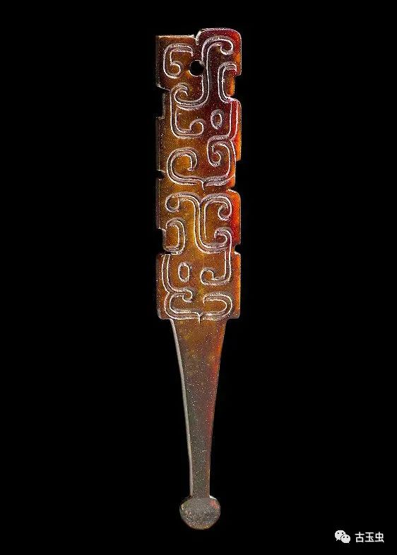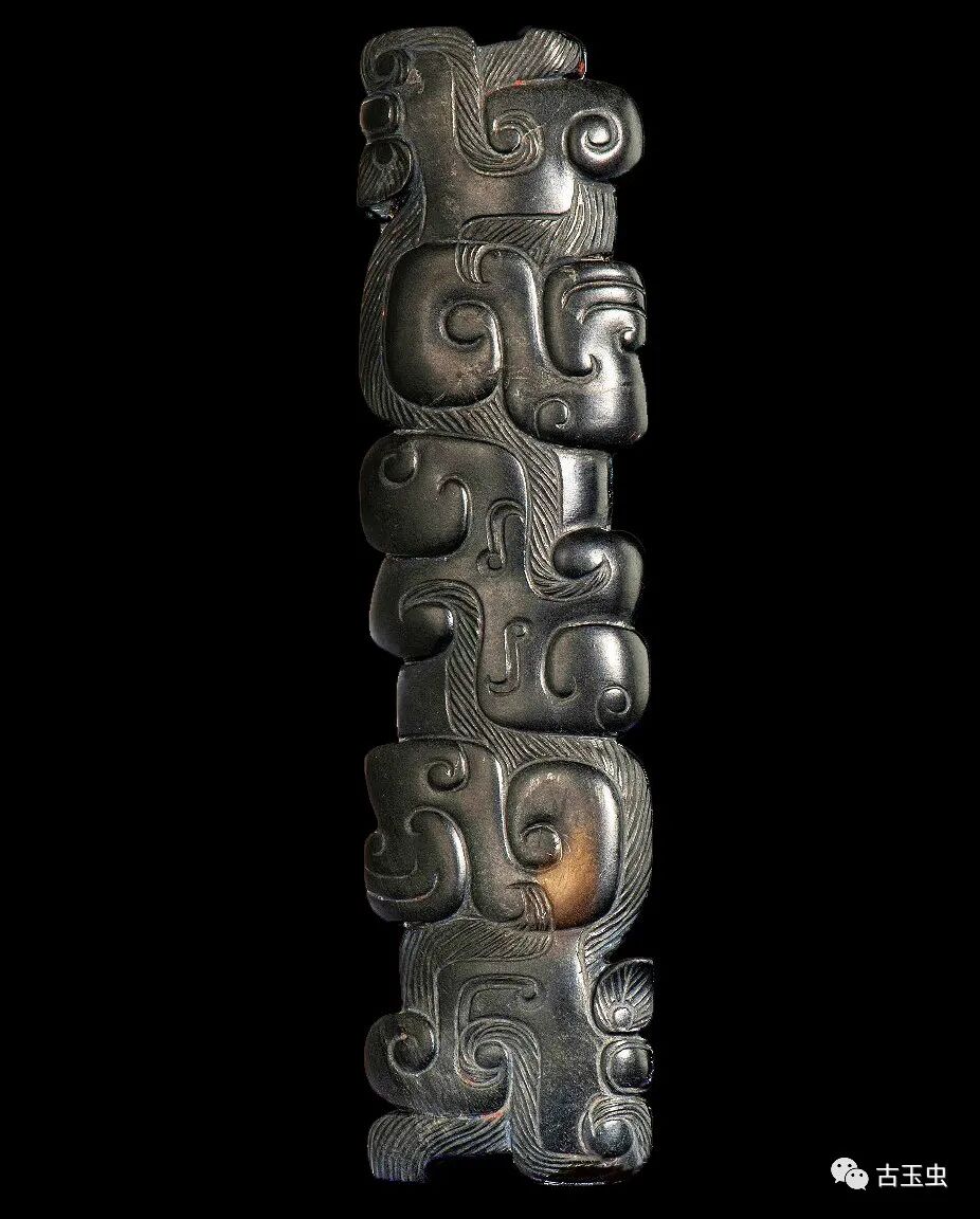 龙纹扁长条形玉饰 春秋时期 长11.4、宽2.85、厚1.2厘米南阳市桐柏县月河镇左庄村墓M1出土,现藏南阳市文物考古研究所 说明:黑色。半圆雕。两端为龙首,怒目、侈口、吐舌、扇形耳,长鬃后披。身饰变形龙纹。有纵向穿。此器采用圆雕与浅浮雕相结合的技法表现龙的形状,造型生动,手法新颖,为同期玉器中的佳作。