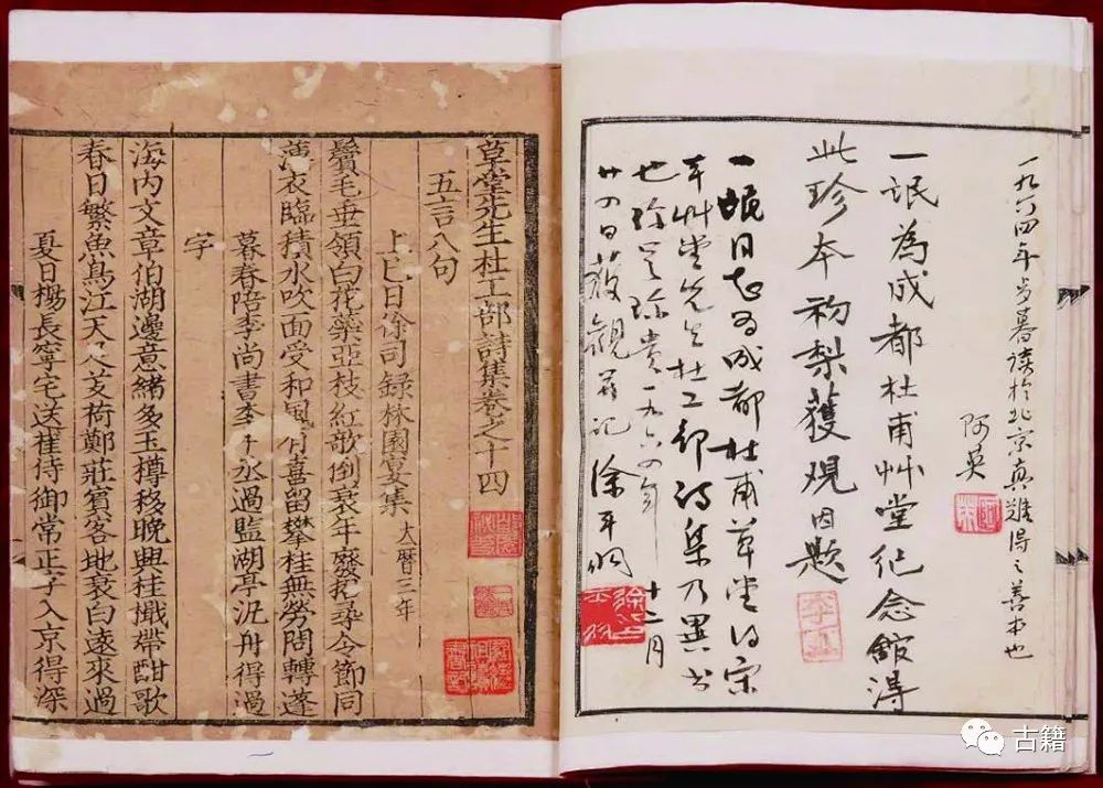 因此,几经波折,这部宋刻杜集终于收归草堂。宋刻残本《杜工部草堂诗笺》宋元递藏情况不明,约正德、嘉靖间前后为苏州顾仁效所得;万历、崇祯间由虞山毛表继藏;清代则经由富察傅鼐、富察昌龄父子以及吴荣光、方功惠、孙达转相收藏;清末民初则归山东黄县丁宪曾、丁菊甦所有,1961年为山东济南古旧书店收得,1964年经李一氓为草堂购得,由成都杜甫草堂收藏至今。
