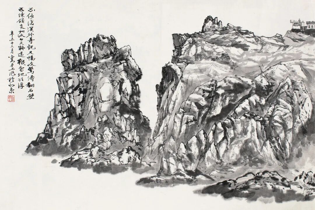 题识:不信沧溟外,奇观尺幅收。惊涛翻石壁,匹练锁炎州。沃日天疑远,鞭雷地欲浮。辛未十二月,刘力上作于北京。
