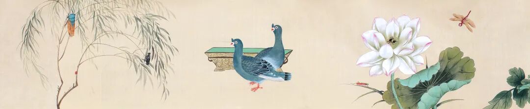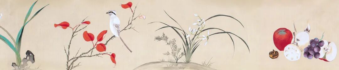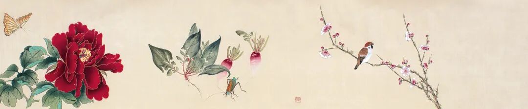 是册手卷创造性地以四季有代表性的花鸟入画,涵括了桃花、荷花、牡丹、柳树、水仙、蔬果、虫鸟等,品类丰富,四时之景尽绘于一卷。花卉、动物刻画仔细,笔法工致,设色艳丽典雅,过渡自然。在勾线用笔上以书法入,表现出形象的气骨,使线条具有表现质感、体积感、空间感的丰富变化。待轮廓勾勒完毕后,再施以重彩,少有晕染。