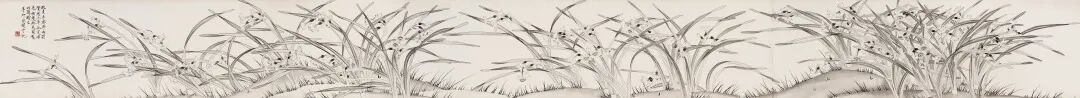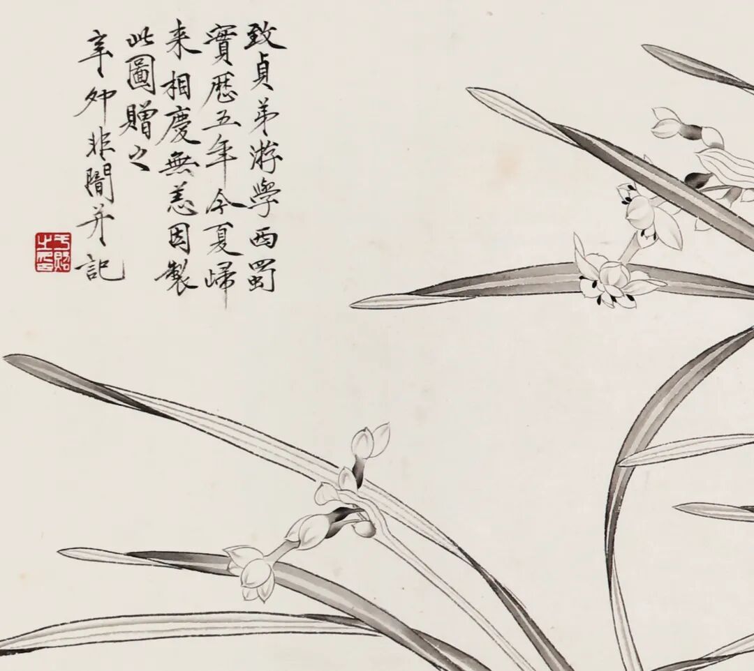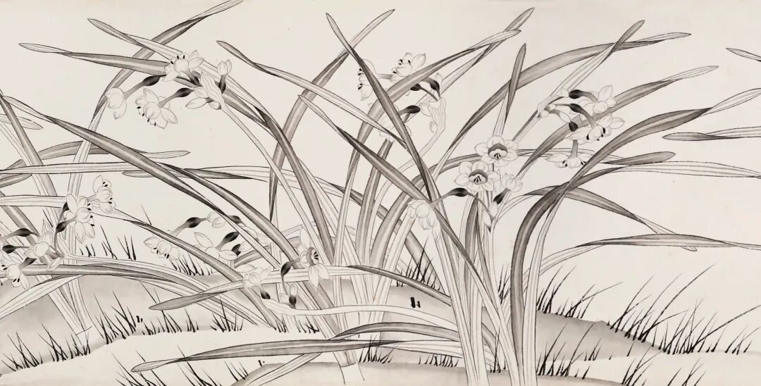 于非闇擅写花卉,或外游所见,或庭园自栽,对之写生,以资画趣。他尤好水仙清雅,袭子固法状写凌波仙态,不沾一丝尘寰混浊。他以工笔白描法成此幅水仙横轴,用笔细致,线条准确,不流于刻板,极得水仙之丰姿神韵。