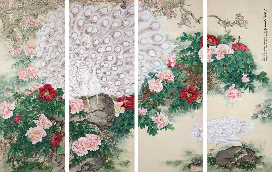 俞致贞(1915~1995) 孔雀屏开富贵春(四屏)