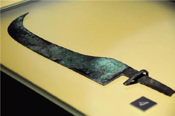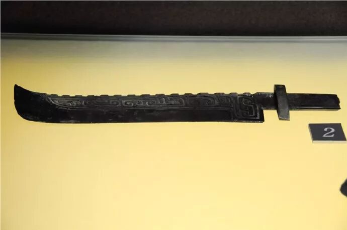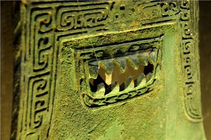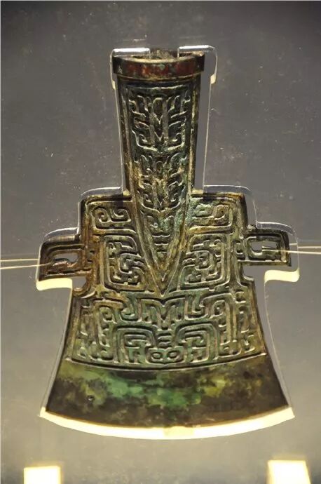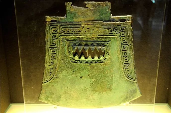 1989年出土于江西新干大洋洲,通高36.5厘米,刃宽36.3厘米,肩厚1厘米,重11.4千克,身厚体重,是目前所见最重的青铜钺。镂出的大口上下各排列双行利齿,口周一圈鱼形几何纹。上边和两侧饰云纹,纹饰宽凹线中嵌满红铜(现大部腐蚀丧失)。在红铜衬托之下白亮的青铜纹饰十分漂亮、耀眼,增添了华美和贵重之感,营造出庄严、肃穆的仪仗氛围。它是中国现存最早采用错金属工艺的商代器物之一。