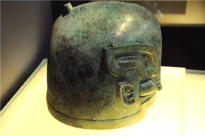 圆顶帽形,中空。正面高浮雕兽面纹,粗大单角外卷,长方圆目横置,卷云状耳竖立,内卷鼻口居中。边沿增厚一周,前面开口收进,如兽面之口。自前至后正中凸脊,顶上伸出一截小圆管,用以安插缨饰。侧边各有一小孔,以穿绳系胄固于颌下。顶侧兽角旁各有一小洞,用作透气。