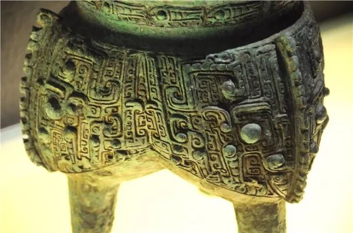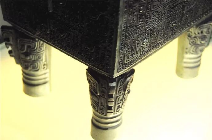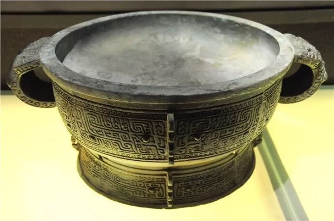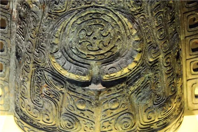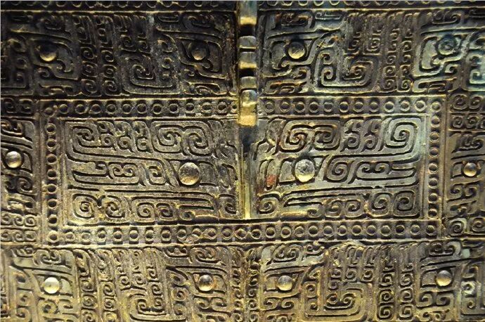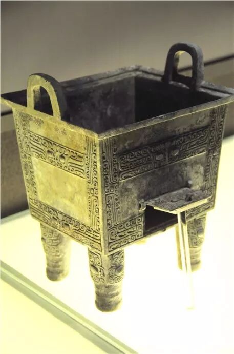 腹部各面饰有上下二层环柱角展体兽面纹,两旁纵向共目夔纹。纹饰线条宽平,图案简明,一侧宽面横开一口,口前置门,门可上下转动启合.还设置了用来固定闭门的插销。外底之上5.5厘米处的腹腔设有内底,内外底间形成夹层,起着炉灶的作用,在夹层里放上炭火,加热的温度虽不及柴火燃烧之高。便可以保持所盛食物常温不冷,美味飘香。