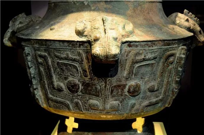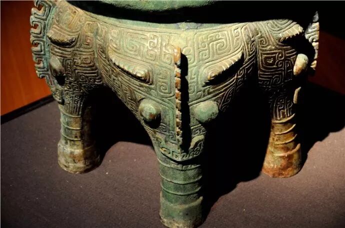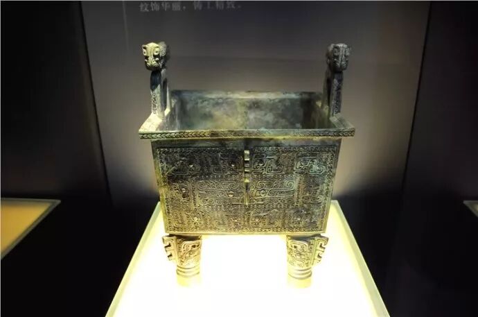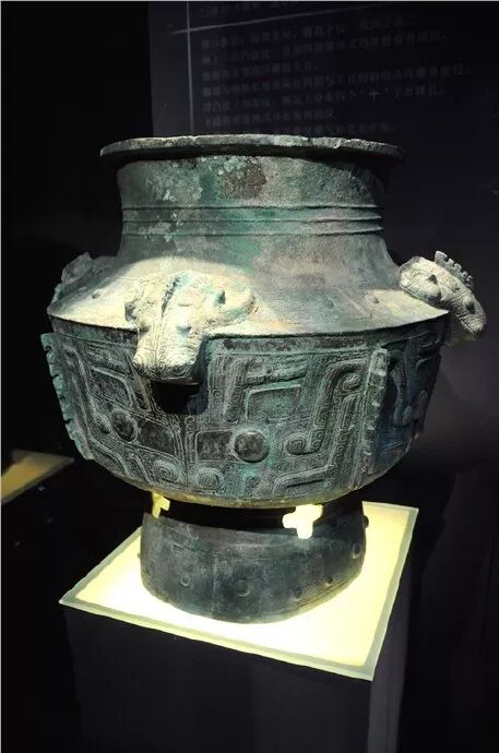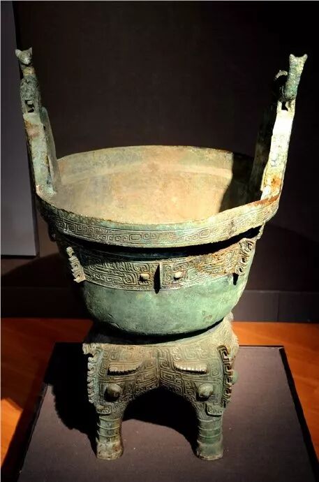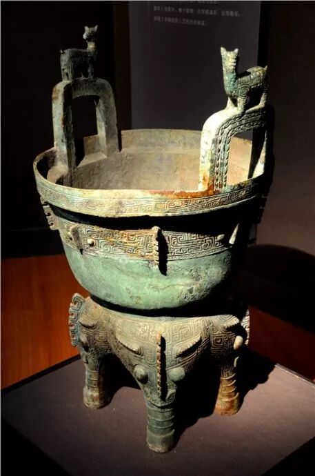 甗,蒸煮器,由上部甑(zèng,音赠)和下部鬲(lì,音历)组成。甑中置箅,盛放食物,鬲内装水,器下烧火,蒸煮食物。此甗甑、鬲连体,束腰分界,内箅不存。两只立耳上各站一鹿,给器物增添了灵气与美感。甑腹上部饰四组展体的环柱角兽面纹,鬲足袋面满饰浮雕的牛角兽面纹。甗体形制巨大,弃常见三足样式而采用四足,稳定性好,气势雄浑,奇美诡异,有“甗王”之誉。除耳上立鹿外,整器一次浑铸成形,体现了青铜范铸工艺的杰出成就。