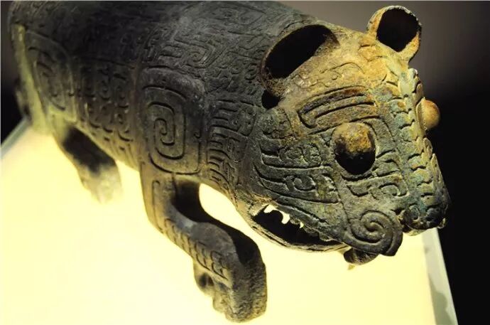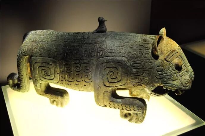 伏鸟双尾青铜虎是青铜虎中体量最大者,可谓虎之王者。其外表透露出虎之威武、勇猛,内中则藏匿着诡谲、仙逸之神气,将虎的神性和虎的崇尚表现到极至。它是文物之奇珍,民族之瑰宝。