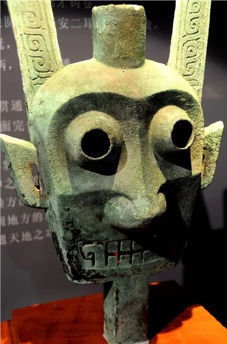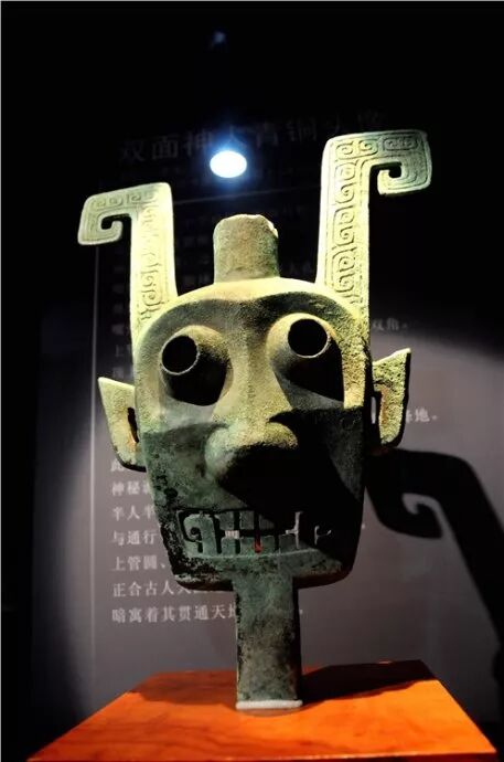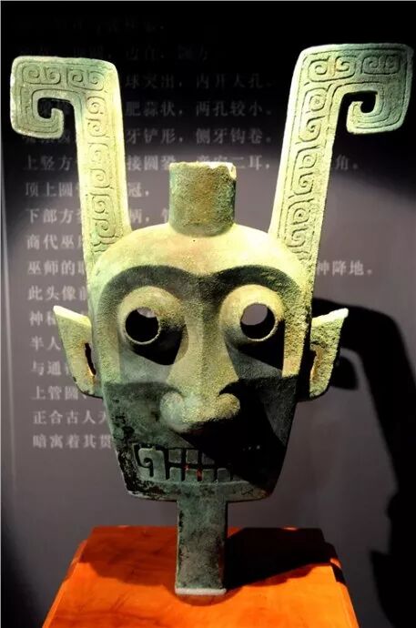 顶上圆管插羽冠,下部方銎安装木柄,管銎相通。上管圆、下銎方的造型和古人天圆地方的理念正合,暗寓着其贯通天地之功能。商代巫风盛炽。巫师的职责乃贯通天地,上天见神,使神降地。此头像前后两面完全对称,一幅神秘诡异、威严慑人的面容,其半人半神的形象与通行于人神之间的巫师身份相符。