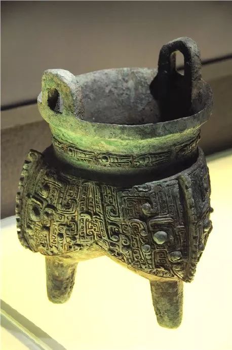 通高70.斜折沿,口敛,方唇,梯形立耳,耳外侧有凹槽,深腹,腹壁较直,圆底近品个,柱足中空,填满泥芯,足底微鼓。腹壁上部饰三组兽面纹带。兽面纹展体式,圆乳钉突目,低鼻,每组间以两组勾戟状扉棱间隔,单尾上卷。足根外侧饰外卷角省体式兽面纹,“臣”字目,勾戟状扉棱在一条直线上。