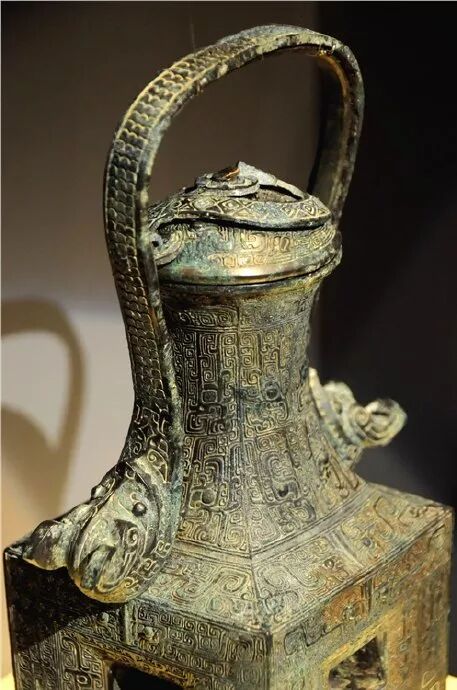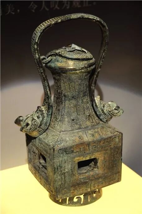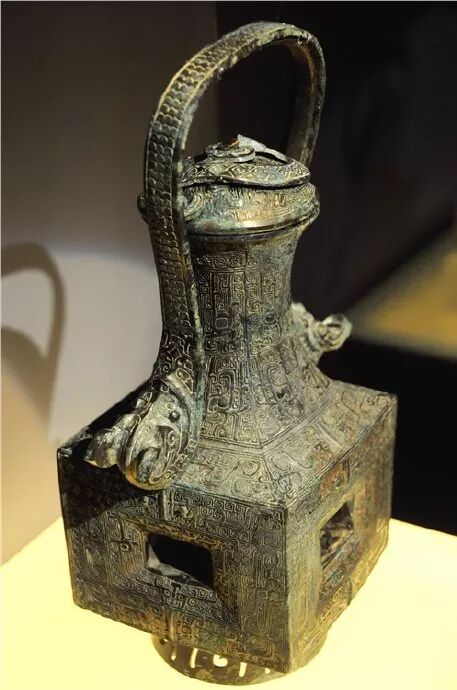 器形别致,上圆颈,中方腹,下圈足。两侧肩钮连系扁平半环形提梁。腹立面横置长方形,截面正方,方形空槽穿通各面中央,水平面呈“十”形。全器满饰纹:口沿下共目夔纹;颈部二层兽面纹;肩部环柱角兽面纹;方腹以槽口为中,分为内外二层,槽口上下的内外四层皆以正中轴分布兽面纹,两侧的内外分布纵向四条共目夔纹。提梁表面层层鳞片,两端高浮凸兽首朝上,双角内卷,圆目特突,张口露出三角形齿,如衔咬宽扁提梁。一条“S”形蟠蛇连系盖和钮,蛇头口咬一环,环中孔洞以插销(残失)与盖连结。蛇尾勾于提梁的环系。矮圈足镂出花纹。方卣不仅纹饰纤细精美,而且器形特别,功能新奇。盛酒之卣坐于热水之中,腹的槽孔扩大了冷酒与热水接触的面积,酒温提高加速。热水烫酒饮之舒适、酣畅。它是目前所知最早的专用水热温酒器。