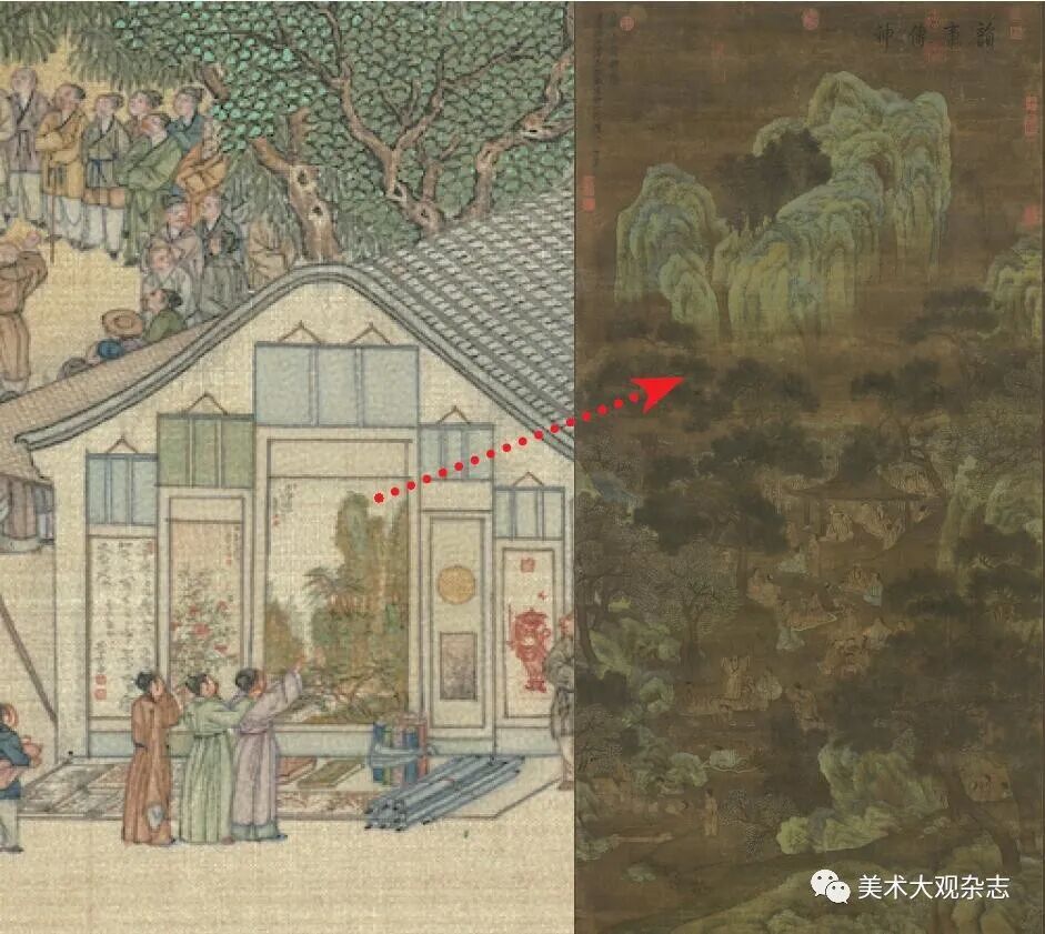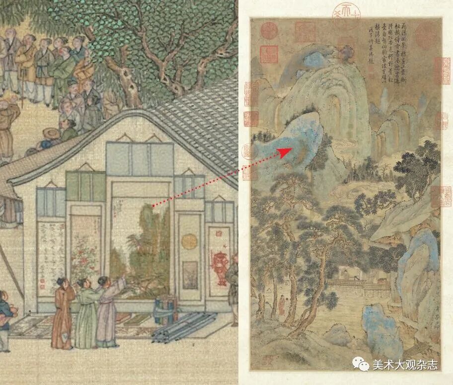 令人感兴趣的是,如果明清苏州片中,古董铺内的古玩选项代表当时文化商品的热门选项,那么,这些清宫本《清明上河图》上所描绘之大量浙派或与浙派宫廷风格相关的画作,究竟可以说明什么样的画史现象?这是否与我们对清初以后以正统派为宗的画史理解有很大的冲突?特别是明代中叶以后,浙派似乎已没落消失,为何相关作品还会出现在彰显清帝国治下繁荣的帝都像中?