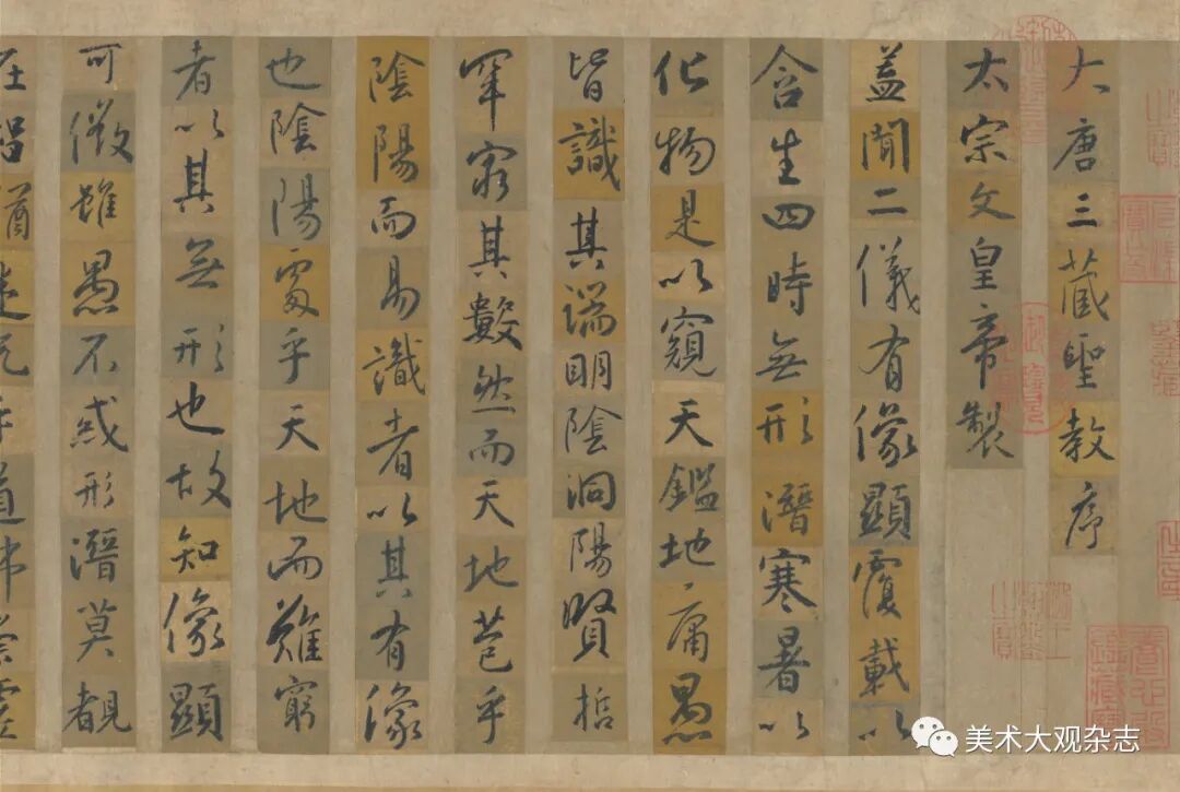 其中最有趣的作品,应该是传为唐代怀仁集字的《圣教序》卷(图18)。集字《圣教序》乃唐太宗贞观二十二年(648)为褒扬玄奘西行取经及译经的功劳而赐予的《圣教序》,内容提到佛教东传及玄奘西行的事迹。其碑由京师弘福寺僧怀仁集内府所藏王羲之书迹,于高宗咸亨三年(672)由诸葛神力勒石、朱敬藏镌刻而成。此碑现在还保存在西安碑林中。其中尚包括太宗的答敕、皇太子(李治,后为高宗)的《述三藏圣教序》及答书,最后附玄奘所译《心经》。由于其乃直接从唐代所存王羲之真迹中摹出,保留原貌,是历代临书的楷模。